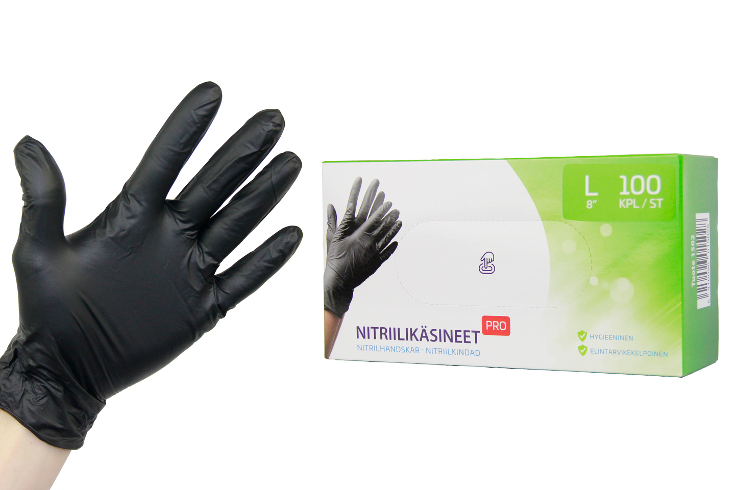 Pakkaus sisältää 100 kertakäyttöistä nitriilikäsinettä.