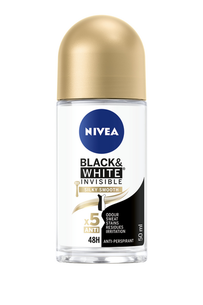 NIVEA Black & White Invisible Silky Smooth Deo Roll-on -antiperspirantti antaa 48 tunnin suojan hikoilua vastaan tahraamatta vaatteitasi! Musta pysyy mustana ja valkoinen valkoisena. Suojaa mustia vaatteita valkoisilta jäljiltä ja ehkäisee keltaisten tahrojen syntymistä valkoisiin vaatteisiin. Sisältää E-vitamiinia, joka pehmentää ja tasoittaa ihoa. Sopii loistavasti sheivauksen jälkeen! Päivittäiseen käyttöön ja aktiiviseen elämään tarkoitettu hellävarainen, hoitava koostumus kuivuu iholle nopeasti ja sopii kaikille ihotyypeille. Hikoilet sitten kuumassa keittiössä, kuntosalilla tai työhaastattelussa - tämä deo ei petä! Ylellinen, miellyttävä tuoksu. Ei sisällä alkoholia ja on dermatologisesti testattu. -> Ei jätä valkoisia jälkiä mustiin vaatteisiin tai keltaisia tahroja valkoisiin vaatteisiin. -> Hellävarainen 48 tunnin hoitava antiperspiranttisuoja -> Pehmentää ja tasoittaa ihoa -> Sopii loistavasti sheivauksen jälkeen -> Ei sisällä alkoholia -> Dermatologisesti testattu Mitä eroa on deodorantilla ja antiperspirantilla? Deodorantit taistelevat hajuja aiheuttavia bakteereja vastaan. Ne sisältävät deodoroivia aktiiveja, jotka estävät bakteereja kasvamasta tai jopa vähentävät bakteerien määrää kainalossa. Antiperspirantit sisältävät antiperspiranttisia aktiiveja – yleensä alumiinisuolaa, joka vähentää hikirauhasten hieneritystä muodostaen tilapäisiä ”geelitulppia” hikirauhasten pinnalle. Nämä tulpat poistuvat ajan saatossa mekaanisesti ja luontaisen ihon uusiutumisen yhteydessä. Antiperspiranteilla on myös deodoroiva vaikutus, sillä ne estävät bakteerien kasvua alemmalla pH-arvollaan ja vähentävät kainalon kosteutta.