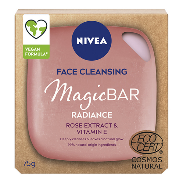 NIVEA MagicBAR Radiance Cleansing Bar -kasvosaippua heleyttää ja puhdistaa ihon tehokkaasti sekä antaa sille luonnollista hehkua. Vegaaninen koostumus sisältää ruusu-uutetta ja E-vitamiinia. Kasvosaippua on hellävarainen iholle ja toimii sopusoinnussa ihosi oman pH-tason kanssa. Ainesosat ovat 99% luonnollisia. Kasvosaippua on pakattu 100% muovittomaan pakkaukseen, jotta jätettä syntyisi mahdollisimman vähän. NIVEA MagicBAR -kasvosaippuat ovat NIVEAn ensimmäinen tuotesarja, joka on saanut Ecocert Cosmos Natural -luonnonkosmetiikkasertifikaatin. Dermatologisesti testattu. Kokonaan kierrätettävä paperipakkaus. NIVEAN kasvosaippuat sisältävät rauhoittavia, hellävaraisia ainesosia, kuten kasvoöljyjä, tärkeitä vitamiineja ja hivenaineita. Puhdistavatkin ainesosat ovat hellävaraisia, samoin vaikuttavat ainesosat, joten jokaiselle ihotyypille löytyy sopiva vaihtoehto. Täydellinen, muoviton vaihtoehto puhdistustuotteelle. Kolme hyvää syytä valita NIVEAN kasvosaippua: 1. Hyvin vähän pakkausmateriaalia -> Parempi ympäristölle 2. Kasvosaippua on riittoisampi kuin nestemäiset tuotteet -> Säästät rahaa 3. Sisältää 99% luonnosta peräisin olevia ainesosia -> Luonnollisempi koostumus