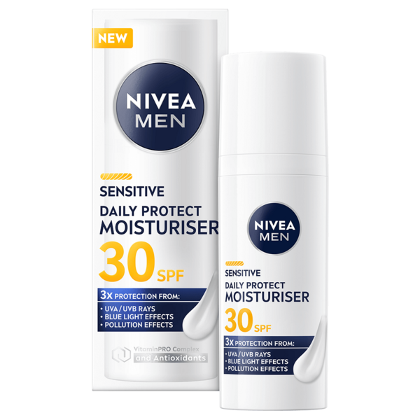 NIVEA MEN Sensitive Daily Protect Moisturiser SK 30 -kasvovoiteen kevyt koostumus imeytyy nopeasti ja antaa iholle välittömän tehokosteutuksen. Erityisesti herkälle iholle kehitetty voide suojaa ihoa UVA/UVB-säteilyltä suojakertoimella 30. Ei jätä rasvaista tunnetta iholle. Antaa iholle vahvan kolminkertaisen suojan: UVA/UVB-säteiltä, Sinivalon vaikutuksilta, Ilmansaasteilta Dermatologisesti testattu.