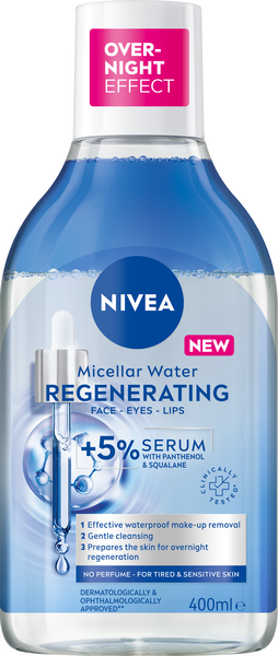 NIVEA Regenerating Micellar Water -misellivesi sisältää 5% seerumia ja aminohappoyhdisteen! Misellivesi poistaa vedenkestävän meikin, epäpuhtaudet ja lian muutamalla kevyellä pyyhkäisyllä, eikä jätä iholle rasvaista tunnetta. Erittäin hellävarainen kasvojenpuhdistus, ei tarvetta hankaukselle. Koostumus sisältää pantenolia ja skvalaania. Misellivesi palauttaa ihon kosteustasapainon ja uudistaa ihoa. Käytä illalla ja misellivesi valmistelee ihon yön aikana tapahtuvaan uudistumiseen ja saa aikaan kauniin ja levänneen näköisen ihon seuraavana aamuna. Ihoa uudistava vaikutus on kliinisesti testattu. Hajusteeton koostumus sopii herkälle iholle. Testattu ihotauti- ja silmälääkäreiden valvonnassa. Uudista ihoa yön aikana NIVEA Regenerating -misellivedellä!
