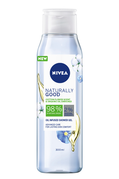 NIVEA Naturally Good Cotton Flower -suihkugeelin ainesosat ovat 98% luonnosta peräisin* ja vegaani koostumus on 99-prosenttisesti biohajoava**. Luonnonmukaista viinirypäleensiemenöljyä sisältävä suihkugeeli ei kuivata, vaan jättää ihon pehmeäksi ja miellyttävän tuntuiseksi. Sisältää ihanan puuvillan kukan tuoksun. Suihkugeelipullon materiaali on 97% kierrätettyä PET-muovia. *luonnosta peräisin olevat ainesosat, jotka säilyttävät yli 50% molekyylirakenteestaan prosessoinnin jälkeen (luonnollinen tila), sisältäen veden **OECD:n tai vastaavien menetelmien mukaisesti