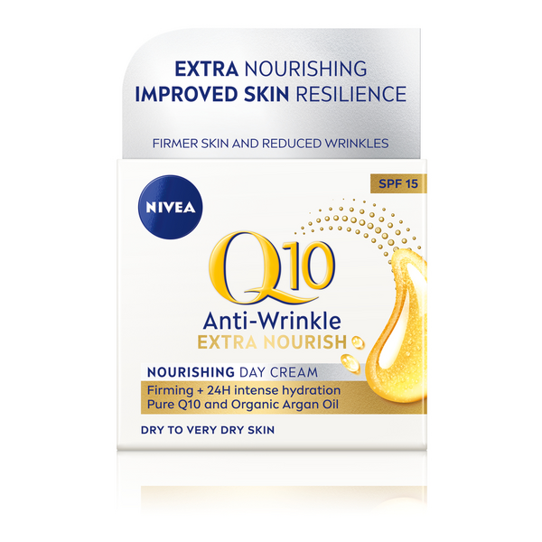 NIVEA Q10 Power Anti-Wrinkle Extra Nourish Day Cream -päivävoide, joka on kehitetty erityisesti kuivalle iholle, joka kaipaa välittöntä helpotusta kosteusköyhyyteen. Kasvovoide kosteuttaa 24H! Erittäin tehokkaasti ravitseva ja ihon kosteustasapainoa elvyttävä. Sisältää kreatiiniä, joka auttaa tehostamaan ihosolujen vaihtuvuutta ja kollageenia, joka antaa iholle täyteläisen ja heleän nuorekkaan ulkonäön. Hoitavana ja ravitsevana ainesosana voiteessa on 100% luonnonmukaisesti viljelty arganöljy, joka sisältää runsaasti ihoa rauhoittavia omega-6- ja -9-rasvahappoja. Kuivan ihon pelastus! Jotta olet täysin valmis ja varautunut päivän haasteisiin voiteessa on suojakerroin 15 ja UVA/UVB-suodattimet, jotka suojaavat UV-säteiden aiheuttamilta vanhenemisen merkeiltä. Levitä iltaisin puhdistetuille kasvoille, kaulalle, decoltee-aluetta unohtamatta. Dermatologisesti testattu. Parhaimman lopputuloksen saat, kun käytät samanaikaisesti tuotteita, joiden ainesosat tukevat ja voimistavat toistensa vaikutuksia. Muista, että kasvoille tarkoitettu kosteusvoide hoitaa ihoasi paremmin kuin yleisvoide. Jokapäiväinen ihonhoito on hyvä aloittaa aamuin illloin puhdistuksella. Kuivalle iholle sopiva NIVEA Gentle Cleansing Cream -puhdistusvoide puhdistaa hellävaraisesti, poistaa meikin tehokkaasti, rauhoittaa ja valmistaa ihon vastaanottamaan hoitotuotteet. NIVEA Q10 Extra Nourish Day Cream -päivävoiteen pariksi sopii täydellisesti NIVEA Q10 Extra Nourish Night Cream -yövoide huolehtimaan, että iho palautuu päivän rasituksista, kiinteytyy ja kosteusvarastot täyttyvät yölläkin. Silmänympärysalueelle aamuin illoin NIVEA Q10 Power Anti-Wrinkle Firming Eye Cream -silmänympärysvoide silottamaan ja kosteuttamaan herkkää silmänympärysaluetta. NIVEA Q10:n patentoitu koostumus sisältää Q10:ä, joka on 100% identtinen ihon oman Q10:n kanssa. Luonnollisella fermentointiprosessilla saatu puhdas ja korkealaatuinen Q10 toimii ihon luonnollisena puolustuksena ihon ennenaikaista vanhenemista vastaan sekä suojaavana antioksidanttina. Voide pitää ihon luonnollisen heleänä ja kosteutettuna samalla taistellen tehokkaasti pieniä juonteita ja ryppyjä vastaan.Ihosi on elinvoimaisempi, suojattu ja raikas! Mutta mikä on koentsyymi Q10:n rooli ja miksi se on niin tehokasta ihonhoidossa? Koentsyymi Q10 (kutsutaan myös ubikinoniksi) on vitamiinin kaltainen aine. Sitä esiintyy luonnostaan jokaisessa elimistön solussa ja sillä on tärkeä merkitys niissä. Se on välttämätöntä energiantuotannon kannalta, jotta ihon perustoiminnot, kuten uudistuminen ja korjaantuminen, olisivat mahdollisia. Koska ihomme on kehon uloin kerros, se altistuu jatkuvasti erilaisille ulkoisille tekijöille, kuten auringon UV-säteiden aiheuttamalle oksidatiiviselle stressille . Lisäksi sisäiset prosessit voivat vapauttaa vapaita radikaaleja, jotka aiheuttavat lisää vahinkoa soluillemme ja nopeuttavat ikääntymisen merkkien ilmaantumista. Q10 täyttää kaksi erittäin tärkeää tehtävää samanaikaisesti: antaa energiaa ja antioksidanttina suojaa soluja. Q10:n kuusi huikeaa ihohyötyä: 1. Antaa iholle sen luonnolliseen korjaantumiseen ja uudistumiseen tarvittavaa energiaa 2. Energisempi iho tarkoittaa säteilevämpää hipiää 3. Auttaa vähentämään auringon aiheuttamia vaurioita 4. Tukee kollageenin tuotantoa 5. Auttaa vähentämään juonteiden ja ryppyjen ilmestymistä 6. Edistää tasaista ihonsävyä