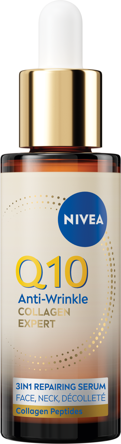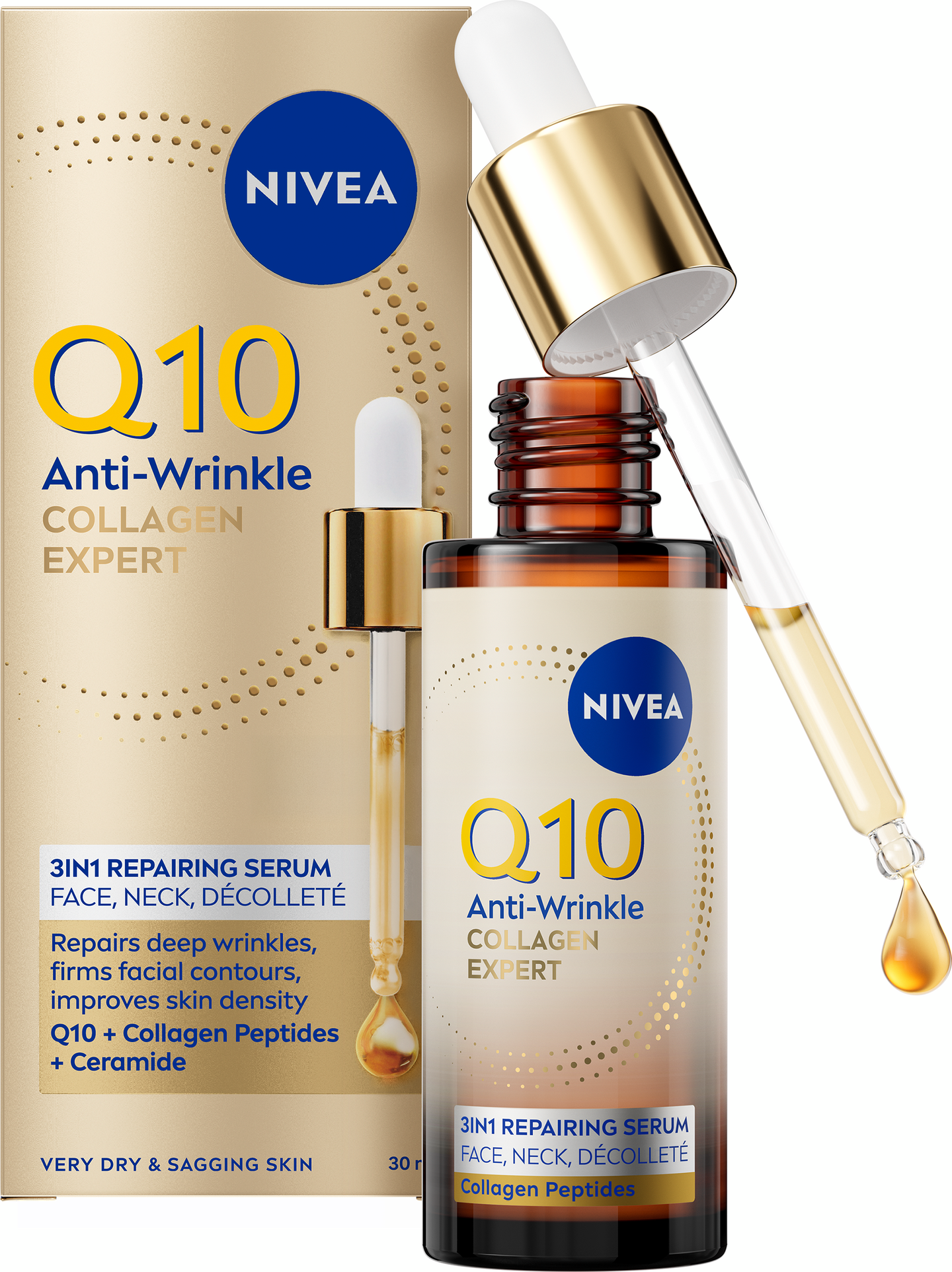 NIVEA Q10 Anti-Wrinkle Collagen Expert 3in1 Repairing Serum -kasvoseerumi kiinteyttää ihoa, vähentää tehokkaasti jopa syvimpiä ryppyjä ja ryhdistää kasvonpiirteitä. Tehokas seerumi sisältää tehokkaan yhdistelmän puhdasta Q10-entsyymiä, keramideja ja kollageenipeptidejä. Tehostaa ihon omaa kollageenin tuotantoa ja tekee ihosta kauniin nuorekkaan ja hyvinvoivan näköisen. Vahvistaa ihon omaa suojamuuria ja kosteuttaa ihoa tehokkaasti 24 tunnin ajan. Käyttämällä yhdessä NIVEA Q10 Day & Night Facial Butter -kasvovoin kanssa 4x kiinteyttävä vaikutus*. Dermatologisesti testattu. Kliinisesti testatut & kuluttajien hyväksymät tulokset: 24 tunnissa: Ihon joustavuus on parantunut. Iho on syväkosteutettu 82%:lla naisista.** 1 viikossa: Vähentää näkyvästi jopa syvimpiä ryppyjä ja ilmejuonteita. 2 viikossa: Kiinteyttää ja ryhdistää kasvonpiirteitä, sekä vähentää veltostunutta ihoa 83%:lla naisista.*** *yhteiskäyttö tarjoaa 4x kiinteyttävän vaikutuksen: ryhdistää kasvonpiirteitä, parantaa ihon kimmoisuutta ja kiinteyttä sekä vähentää ryppyjä **kliininen tutkimus, 33 naista, 2025 ***itsearviointi, 42 naista, 2025