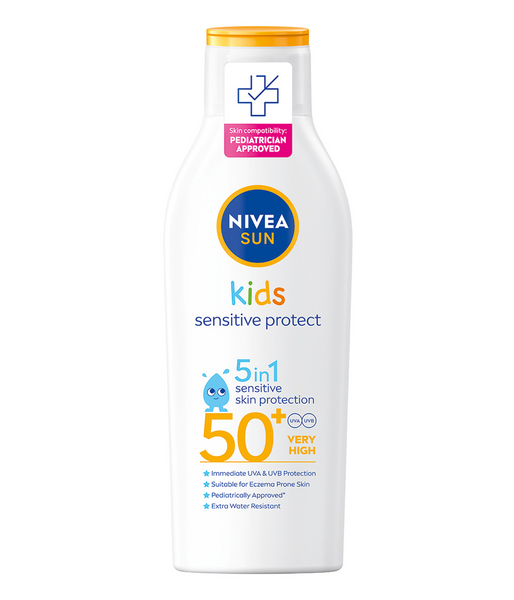 NIVEA SUN Kids Sensitive Protect Sun Lotion SK50+ -aurinkosuojavoide sisältää erittäin korkealaatuisia UVA- ja UVB-suodattimia, jotka takaavat välittömän ja pitkäkestoisen suojan! Aurinkovoide on kehitetty erityisesti lasten herkälle iholle ja se on lastenlääkäreiden hyväksymä. Suojakerroin erittäin korkea 50+. Väriaineeton, hajusteeton ja säilöntäaineeton, vähentää aurinkoallergian riskiä. Tahmaamaton ja kevyt koostumus sekä erittäin vedenkestävä. NIVEA SUN -tuotteilla voit olla huoletta auringolta suojattuna. Tuotteelle on myönnetty Allergia-, Iho- ja Astmaliiton Allergiatunnus! Dermatologisesti testattu. -> Hoitava, vedenkestävä koostumus on kehitetty erityisesti lasten herkälle iholle -> Auttaa ehkäisemään auringoallergian syntymistä -> Erittäin tehokas UVA/UVB-suoja -> Erittäin korkea suojakerroin suojaa välittömästi ihoa auringonpolttamilta ja auringon aiheuttamilta pysyviltä ihovaurioilta -> Ei sisällä hajusteita, säilöntäaineita tai väriaineita Hyväksi iholle, hyväksi ympäristölle! -> 67% biohajoava koostumus -> Vesistöjä kunnioittava koostumus ei sisällä Octinoxate-, Oxybenzone- ja Octocrylene- UV-suodattimia, eikä mikromuovia -> 50% kierrätetystä muovista valmistettu pakkaus (pois lukien korkki ja etiketti) Mitä allergiatunnus tarkoittaa? Allergiatunnuksen myöntää Allergia-, Iho- ja Astmaliitto ry toteuttaen arviointityön yhteistyössä ulkopuolisten asiantuntijoiden ja tutkijoiden kanssa. Allergiatunnus on merkki siitä, että tuote täyttää allergiakriteerit; tuotteet eivät sisällä yleisesti herkistäviä tai ärsyttäviä aineita tai materiaaleja. Tuotteet eivät myöskään sisällä hajusteita. Allergiatunnus auttaa valitsemaan tuotteen, joka ei myöskään aiheuta hengitystievaikeuksia tai laukaise tuoksuyliherkkyysoireita. Tarvitsevatko lapset erilaisia aurinkosuojatuotteita kuin aikuiset? Lapset ovat erityisen herkkiä UV-säteilyn aiheuttamille ihovaurioille. Heidän herkkä ihonsa on vielä haavoittuvainen, ja todella pienten lasten tapauksessa ihon luontainen suojaus ei ole vielä täysin kehittynyt. Ihon täysi paksuus ja kyky pigmentoitua tulevat vasta teini-iässä. Lapsena tapahtuneet auringonpolttamat liittyvät ihosyöpään vanhempana, joten lasten tulisi käyttää auringonsuojatuotteita, joissa on korkea tai erittäin korkea aurinkosuojakerroin. Lapset myös rakastavat uimista. Tämä vähentää heidän ihonsa omaa UV-suojaa ja pyyhkii pois osan UV-suodattimista. Jotta aurinkosuojataso pysyy yllä mahdollisimman pitkään, lapsille tarkoitetut voiteemme ja suihkeemme ovat erittäin vedenkestäviä. Miksi auringolta suojautuminen on niin tärkeää? Auringolta suojaamisesta ei voi ikinä muistuttaa liikaa. Kukapa ei haluaisi nauttia kesästä, olla auringossa ja saada ihanan päivetyksen iholle, mutta se on hyvä tehdä turvallisesti. Auringolta kannattaa suojautua, sillä ihon palaminen altistaa ihosyöville. Iholle jää muistijälki jokaisesta palamisesta ja se vaurioituu säteilystä pikkuhiljaa vuosien saatossa. UV-säteily myös vanhentaa ja kuivattaa ihoa sekä altistaa maksaläiskille. Riittävällä suojautumisella eli vaatteilla, suojakerrointuotteilla ja aurinkolaseilla pystymme viettämään aikaa auringossa turvallisin mielin. Miten vedenkestävä määritellään? Euroopassa vedenkestävyyden testaukseen on olemassa vain yksi hyväksytty standardi, jonka on hyväksynyt Cosmetics Europe (kosmetiikka-alan yläorganisaatio). Tämän standardin mukaisesti kaikki vedenkestävät aurinkosuojatuotteemme on testattu ulkopuolisissa, itsenäisissä laitoksissa ja ne ovat läpäisseet vedenkestävyyden kriteerit. Testikäyttäjät kylpevät 2x20 min (vedenkestävä) tai 4x20 min (erittäin vedenkestävä) tuotteen käytön jälkeen, minkä jälkeen jäljelle jääneen aurinkosuojan tulee olla yli 50 % alkuperäisestä arvosta. Vedenkestävyys ei siis tarkoita sitä, että alkuperäinen aurinkosuoja kestää rajoittamattoman ajan.