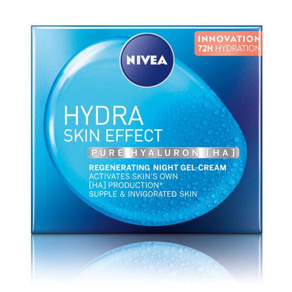 NIVEA Hydra Skin Effect Regenerating Night Gel-Cream -yövoiteessa on innovatiivinen, puhdasta hyaluronia [HA], sisältävä koostumus, joka aktivoi ihon oman hyaluronin tuotantoa*. Voiteessa on käytetty kahta eri pituista hyaluronihappoa: pitkäketjuinen hyaluronihappo sitoo kosteutta ihon ylimpiin kerroksiin ja lyhytketjuinen hyaluronihappo aktivoi ihon omaa hyaluronituotantoa. Ihosi saa tehokosteutta myös sisältä päin 72 tunnin ajan ja uudistuu. Erittäin puhdaslaatuinen hyaluronihappo on puhdistettu fermentointiprosessia hyväksikäyttämällä. Nopeasti imeytyvä, kevyt kasvovoide sulautuu ihoon ja tekee ihosta raikkaan. Iholle ei jää rasvaista tunnetta. Raikas, miellyttävä tuoksu. *Testattu in vitro Parhaimman lopputuloksen saat, kun käytät samanaikaisesti tuotteita, joiden ainesosat tukevat ja voimistavat toistensa vaikutuksia. Muista, että kasvoille tarkoitettu kosteusvoide hoitaa ihoasi paremmin kuin yleisvoide. Jokapäiväinen ihonhoito on hyvä aloittaa aamuin illloin puhdistuksella. Valitse NIVEA -puhdistustuotteista omalle ihotyypillesi sopiva vaihtoehto. Ja kun haluat antaa iholle kauniin hehkun ja maksimoida hyaluronihapon vaikutukset laitat NIVEA Hydra Skin Effect Moisturizing Day Cream -päivävoiteen alle Hydra Skin Effect Serum -kasvoseerumin. Illalla Hydra Skin Effect Regenerating Night Gel-Cream -yövoide huolehtimaan, että iho tehokosteutuu yölläkin. Ajatuksena on, että mihin päivävoide iltapuhdistuksella lopettaa työnsä, jatkaa yövoide siitä työtä aamupuhdistukseen asti. Silmänympärysalueelle aamuin illoin esimerkiksi Cellular Expert Filler Eye & Lip Contour Cream -silmänympärysvoide silottamaan ja kosteuttamaan herkkää silmänympärysaluetta. Mikä on Hyaluronihappo? Hyaluronihappo on kehon oma aine, jolla on kyky sitoa itseensä suuri määrä vettä. Hyaluronihappo on yksi soluja uudistavista ainesosista ja vastaa siitä, että ihon kosteustasapaino säilyy riittävällä tasolla. Lisäksi se auttaa tukemaan ihon rakennetta, joka on iholle elintärkeää! Hyaluronihapon puute ihossa aiheuttaa elastisuuden vähenemiseen, jolloin iho kuivuu ja juonteet alkavat näkyä selkeämmin.