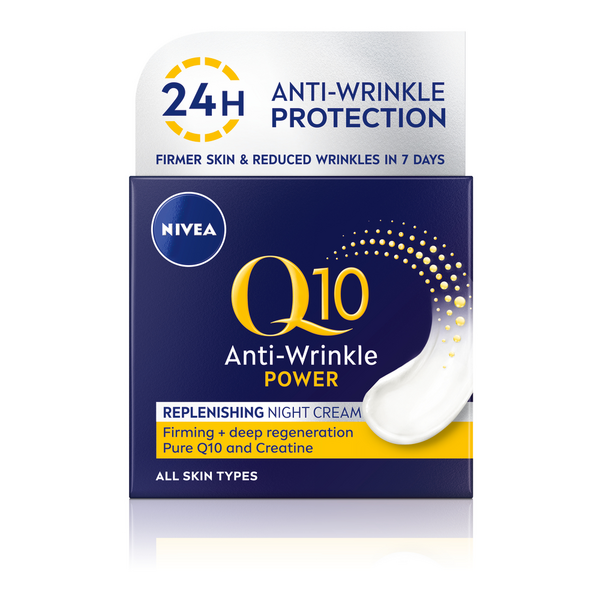 NIVEA Q10 Power Anti-Wrinkle Replenishing Night Cream -yövoide on kehitetty erityisesti normaalille, mutta elvytystä ja kosteutusta kaipaavalle iholle. Vähentää ryppyjä ja tekee ihosta kiinteämmän jopa 7 päivässä! Kasvovoide taistelee tehokkaasti pieniä juonteita ja ryppyjä vastaan jättäen ihon näkyvästi kimmoisammaksi. Uudistaa ja korjaa ihoa tehokkaasti yön aikana, jolloin iho parhaiten vastaanottaa kosteutusta ja aktiivisia ainesosia. Sisältää Q10:n lisäksi myös ihoa uusivaa dexpantenolia, joka vahvistaa ihon luonnollista suojakerrosta ja näin auttaa kosteustasapainon ylläpitoa. Aamu on ihana aloittaa, kun iho on elpynyt, syvältä ravittu ja kosteutettu yön aikana. Levitä iltaisin puhdistetuille kasvoille ja kaulalle, decoltee-aluetta unohtamatta. Dermatologisesti testattu. Parhaimman lopputuloksen saat, kun käytät samanaikaisesti tuotteita, joiden ainesosat tukevat ja voimistavat toistensa vaikutuksia. Muista, että kasvoille tarkoitettu kosteusvoide hoitaa ihoasi paremmin kuin yleisvoide. Jokapäiväinen ihonhoito on hyvä aloittaa aamuin illloin puhdistuksella. Kaikille sopiva NIVEA 5in1 Micellar Water Sensitive Skin -misellivesi puhdistaa hellävaraisesti, poistaa meikin tehokkaasti, rauhoittaa ihoärsytystä ja valmistaa ihon vastaanottamaan hoitotuoteet. NIVEA Q10 Power Replenishing -yövoiteen pariksi sopii täydellisesti ihotyyppisi mukaan mikä vain NIVEA Q10 -päivävoiteista huolehtimaan, että iho saa tarvittavan suojan ja kosteutuksen päivän haasteisiin. Silmänympärysalueelle aamuin illoin NIVEA Q10 Power Firming -silmänympärysvoide silottamaan ja kosteuttamaan herkkää silmänympärysaluetta. NIVEA Q10:n patentoitu koostumus sisältää Q10:ä, joka on 100% identtinen ihon oman Q10:n kanssa. Luonnollisella fermentointiprosessilla saatu puhdas ja korkealaatuinen Q10 toimii ihon luonnollisena puolustuksena ihon ennenaikaista vanhenemista vastaan sekä suojaavana antioksidanttina. Voide pitää ihon luonnollisen heleänä ja kosteutettuna samalla taistellen tehokkaasti pieniä juonteita ja ryppyjä vastaan. Ihosi on elinvoimaisempi, suojattu ja raikas! Mutta mikä on koentsyymi Q10:n rooli ja miksi se on niin tehokasta ihonhoidossa? Koentsyymi Q10 (kutsutaan myös ubikinoniksi) on vitamiinin kaltainen aine. Sitä esiintyy luonnostaan jokaisessa elimistön solussa ja sillä on erittäin tärkeä merkitys niissä. Se on välttämätöntä energiantuotannon kannalta, jotta ihon perustoiminnot, kuten uudistuminen ja korjaantuminen, olisivat mahdollisia. Koska ihomme on kehon uloin kerros, se altistuu jatkuvasti erilaisille ulkoisille tekijöille, kuten auringon UV-säteiden aiheuttamalle oksidatiiviselle stressille. Lisäksi sisäiset prosessit voivat vapauttaa vapaita radikaaleja, jotka aiheuttavat lisää vahinkoa soluillemme ja nopeuttavat ikääntymisen merkkien ilmaantumista. Q10 täyttää kaksi erittäin tärkeää tehtävää samanaikaisesti: antaa energiaa ja antioksidanttina suojaa soluja. Q10:n kuusi huikeaa ihohyötyä: 1. Antaa iholle sen luonnolliseen korjaantumiseen ja uudistumiseen tarvittavaa energiaa 2. Energisempi iho tarkoittaa säteilevämpää hipiää 3. Auttaa vähentämään auringon aiheuttamia vaurioita 4. Tukee kollageenin tuotantoa 5. Auttaa vähentämään juonteiden ja ryppyjen ilmestymistä 6. Edistää tasaista ihonsävyä