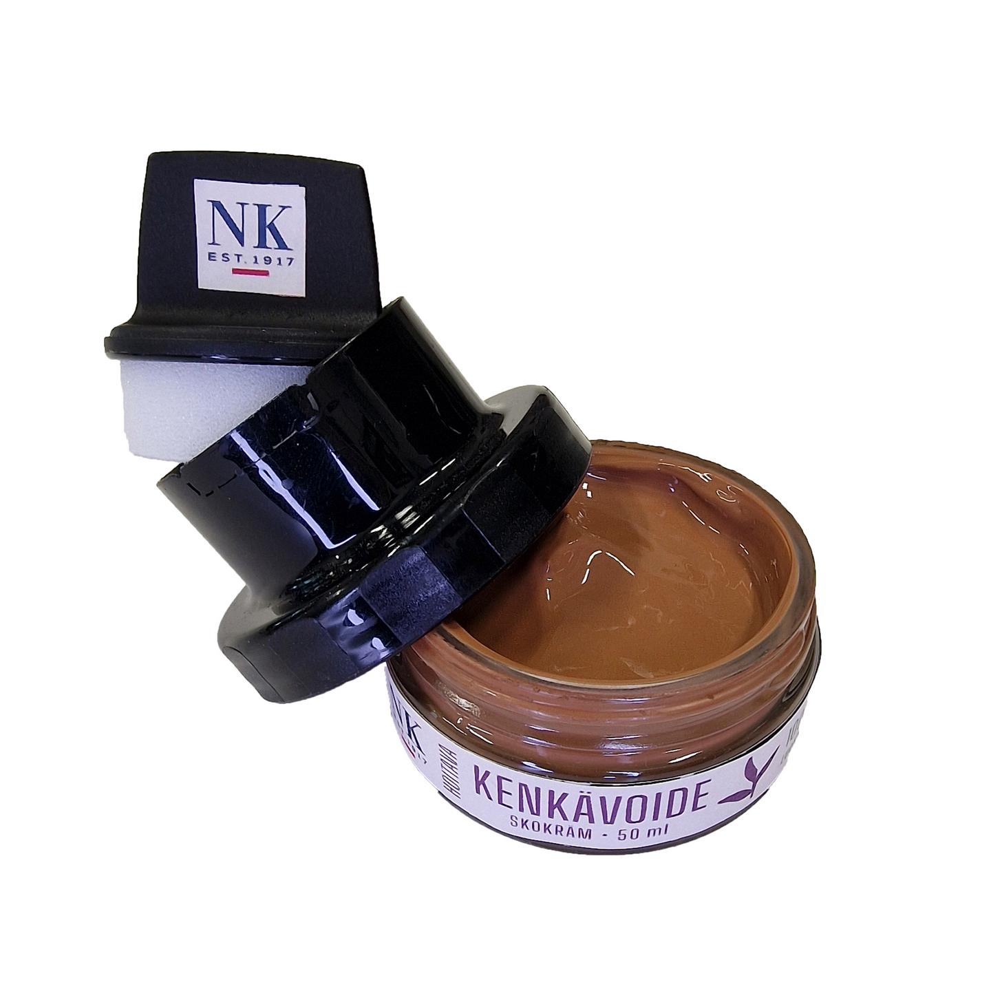 Helppokäyttöinen kenkävoide levityssienellä. Kirkastaa väriä ja hoitaa nahkaa