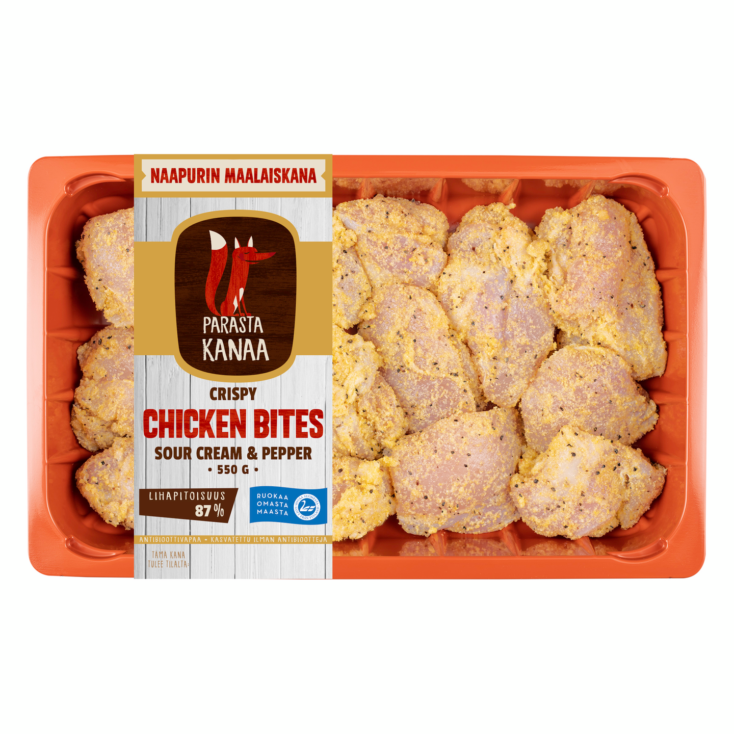 Naapurin Maalaiskanan Crispy Chicken Bites Sour Cream & Pepper valmistetaan ilman lisäaineita ja lisättyä vettä. Paistileikkeestä leikatut gluteenittomat Bitesit saavat makunsa sipsien maailmasta. Maista ja tykästy!