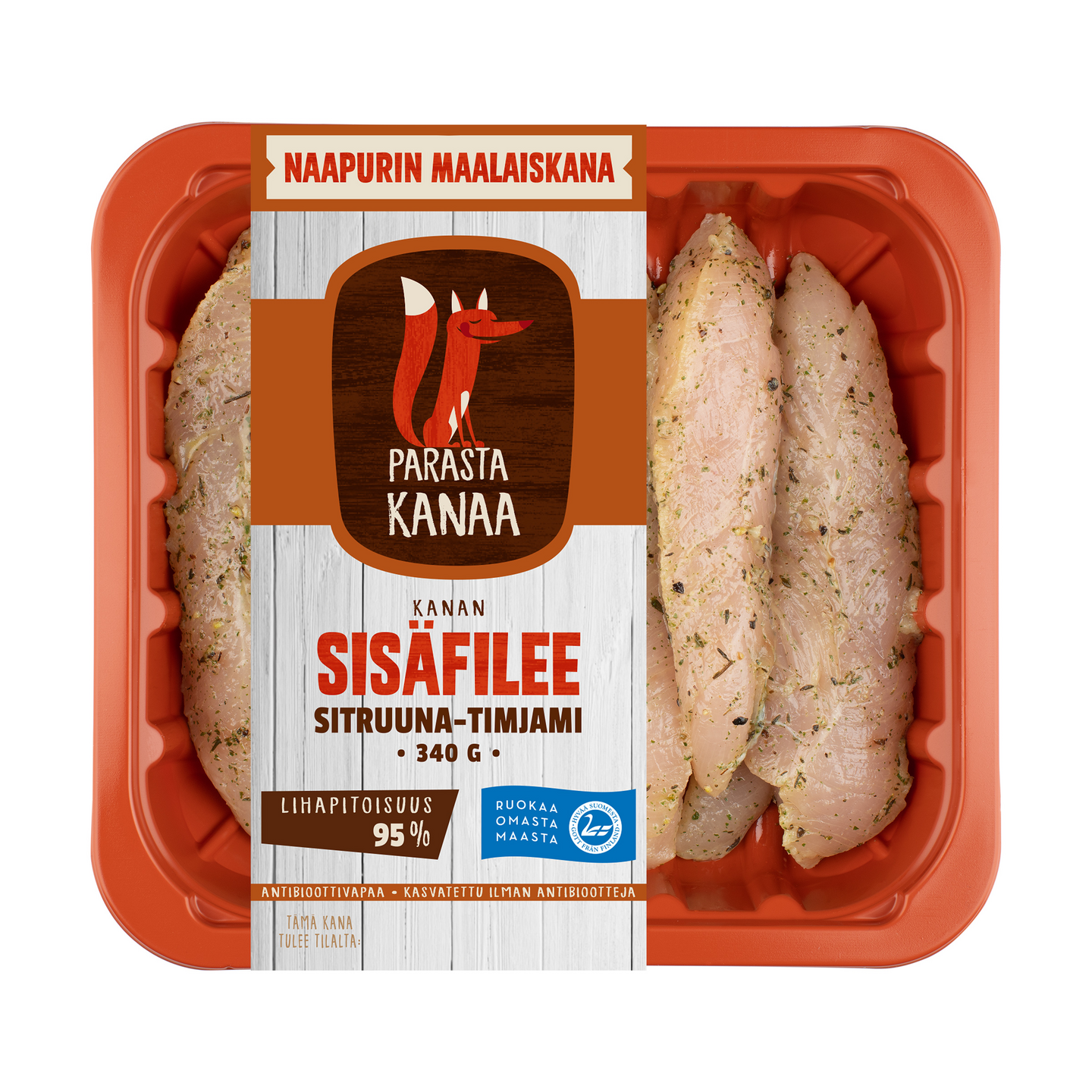 Naapurin Maalaiskanan maukkaat Sitruuna-Timjami Sisäfileet valmistetaan ilman lisäaineita ja lisättyä vettä. Raikkaan sitruunaiset kanan sisäfileet on maustettu timjamilla, mustapippurilla sekä sitruunamehulla. Maista ja tykästy!