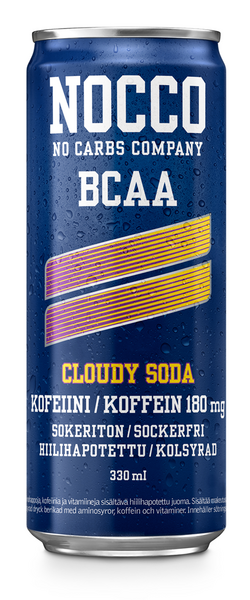 NOCCO Cloudy Soda maistuu taivaallisen passionin ja appelsiinin yhdistelmältä. NOCCO Cloudy Soda on sokeriton ja raikas juoma, joka sisältää kofeiinia sekä vitamiineja. NOCCO BCAA -juomat sisältävät BCAA-aminohappoja (haaraketjuisia aminohappoja), vihreää tee-uutetta, kofeiinia ja kuutta eri vitamiinia. Raikkaan makuiset juomat on hiilihapotettu eivätkä ne sisällä lainkaan sokeria (makeutettu sukraloosilla).