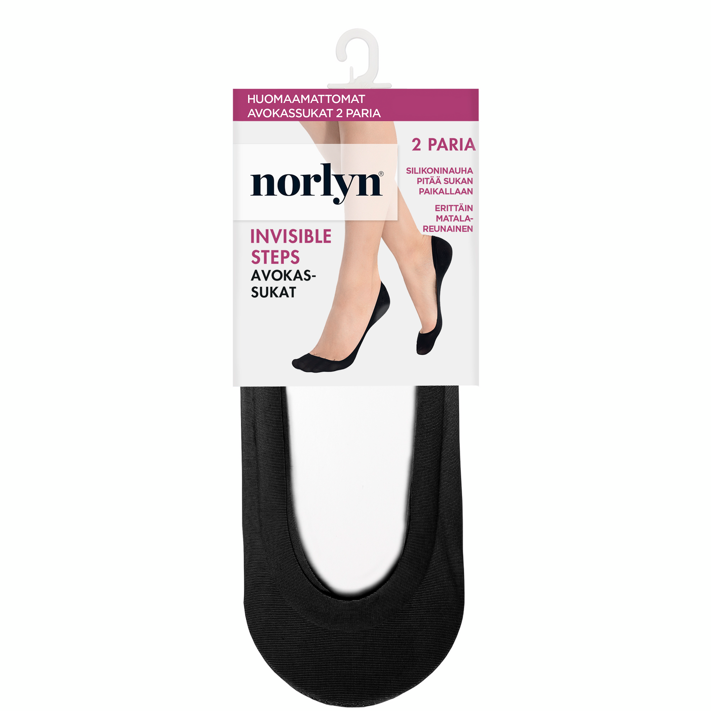 Norlynin matalareunaiset ja huomaamattomat avokassukat kahden parin pakkauksessa. Ohuet, laserleikatut reunat lisäävät käyttömukavuutta. Reunan kiertävä silikoninauha pitää sukan paikallaan. Koostumus: 85% polyamidi, 15% elastaani