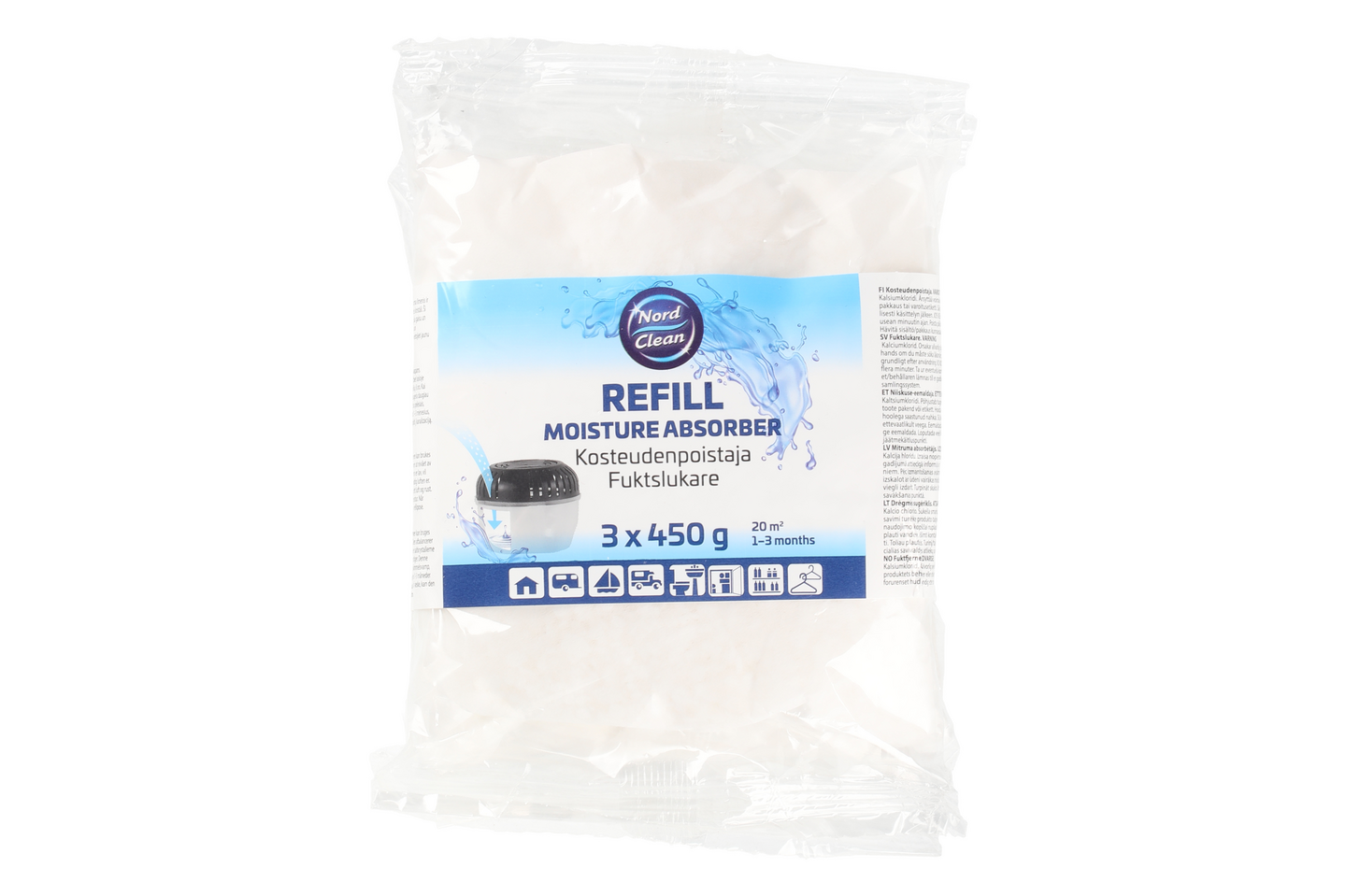 Täyttöpussi kosteudenpoistajaan. Poistaa liiallisen ilmankosteuden estäen homeen ja hajun muodostumista. Kesto 1-3 kk. Kosteudenpoistajaa voidaan käyttää vuoden ympäri kaikissa olosuhteissa ja lämpötiloissa. Tarvittaessa se tasaa kosteuden sitomalla ylimääräisen ilmankosteuden itseensä. Mikäli ilman kosteuspitoisuus on alhainen, suolakiteet ovat lepotilassa. Mitä suurempi ilmankosteus on, sitä enemmän kosteutta imeytyy kiteisiin. Tämä ominaisuus tekee kosteudenpoistajasta erittäin tehokkaan avun hometta, tunkkaista hajua ja ruostumista vastaan. Yksi täyttöpussi riittää 1–3 kuukauden käyttöön kosteuden määrästä ja lämpötilasta riippuen. Kun astia on täynnä nestettä, tyhjennä se viemäriin ja ota käyttöön uusi täyttöpakkaus. Erinomainen esimerkiksi kylmillään oleviin mökkeihin ja retkiveneisiin. Materiaali: kalsiumkloridi.