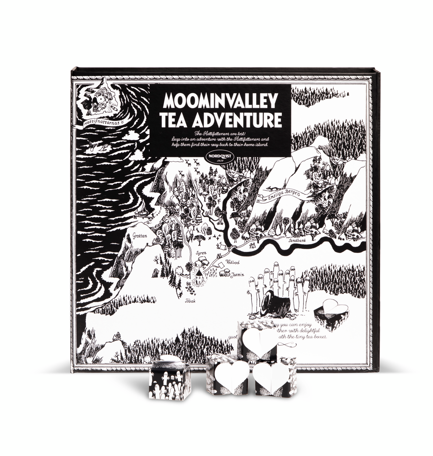 Hattivatit ovat kadonneet! Heittäydy seikkailuun Hattivattien kanssa ja auta heitä löytämään reitti takaisin kotisaarelle. Matkan varrelta löydät herttaisia paketteja, joihin kätkeytyy herkullisesti maustettua teetä pyramidipusseissa ja salaperäisiä pieniä viestejä. Teeseikkailu tuo esille Tove Janssonin varhaiset muumihahmot elegantissa ja mustavalkoisessa pakkauksessa. Muumi Teeseikkailussa on ihastuttava 24 maun valikoima erilaisia Nordqvistin teetalon teelaatuja. Laatikon sisältä löydät herttaisia paketteja, joihin kätkeytyy herkullisesti maustettua teetä pyramidipussissa ja salaperäisiä pieniä viestejä. Teelaadut ovat Rainforest Alliance-sertifioituja.