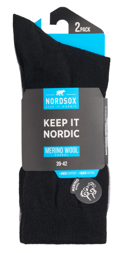 Pakkauksessa 1 pari mustia sukkia ja 1 pari vaaleanharmaita sukkia. Materiaali: 40 % mulesing vapaata merinovillaa, 44 % akryylia, 15 % polyamidia, 1 % elastaania.