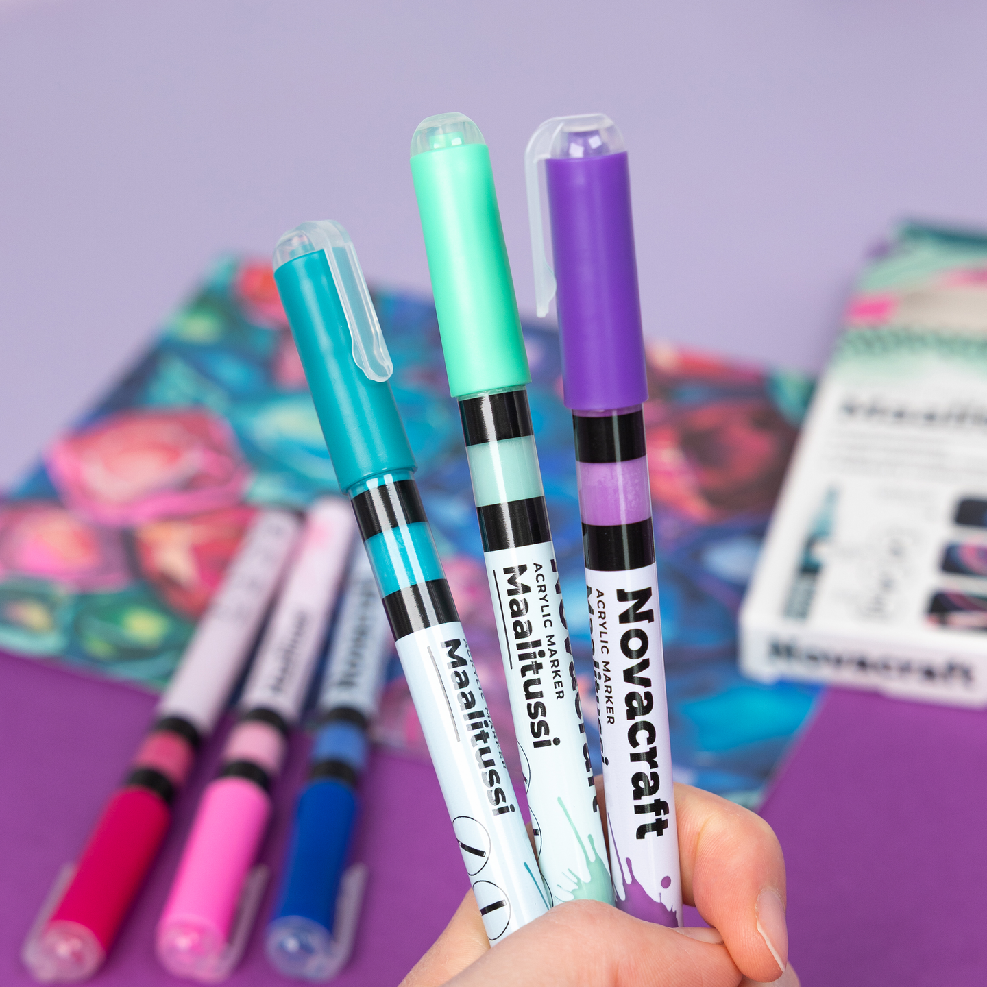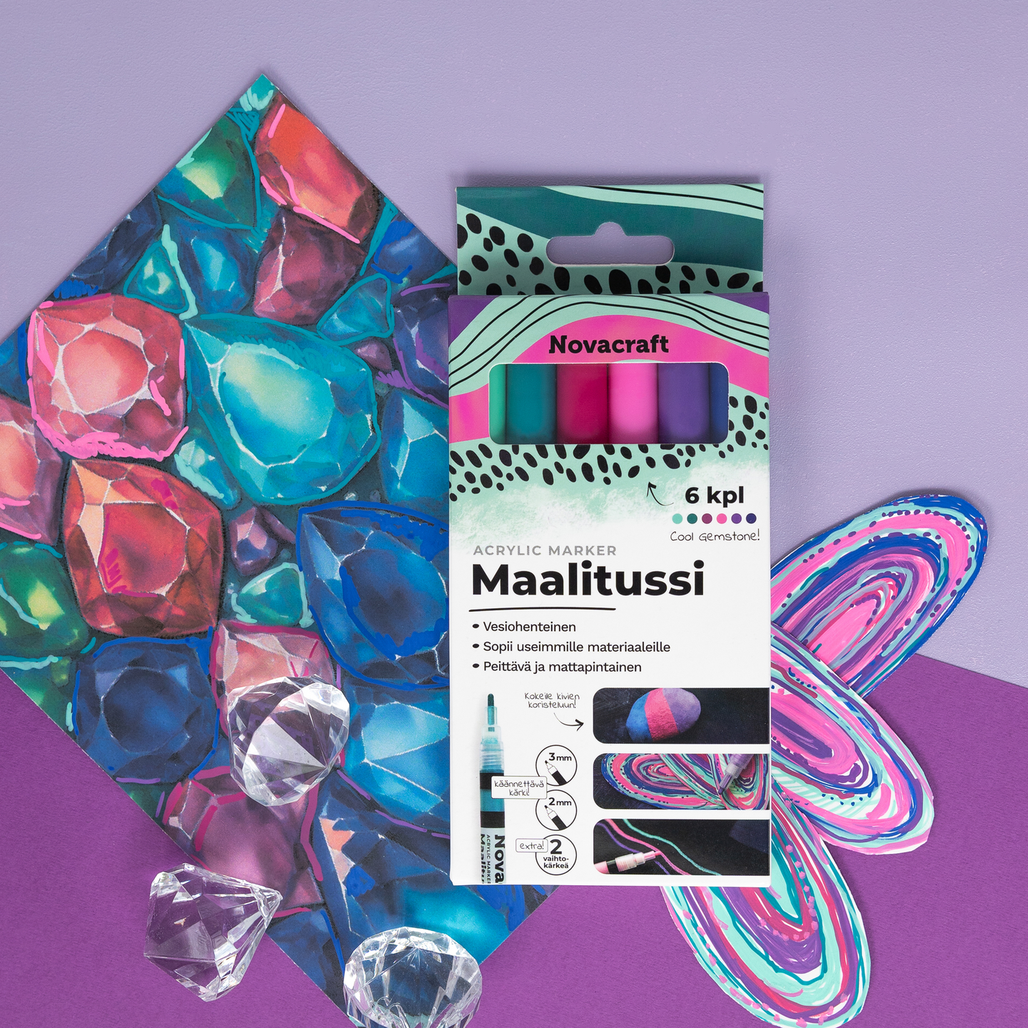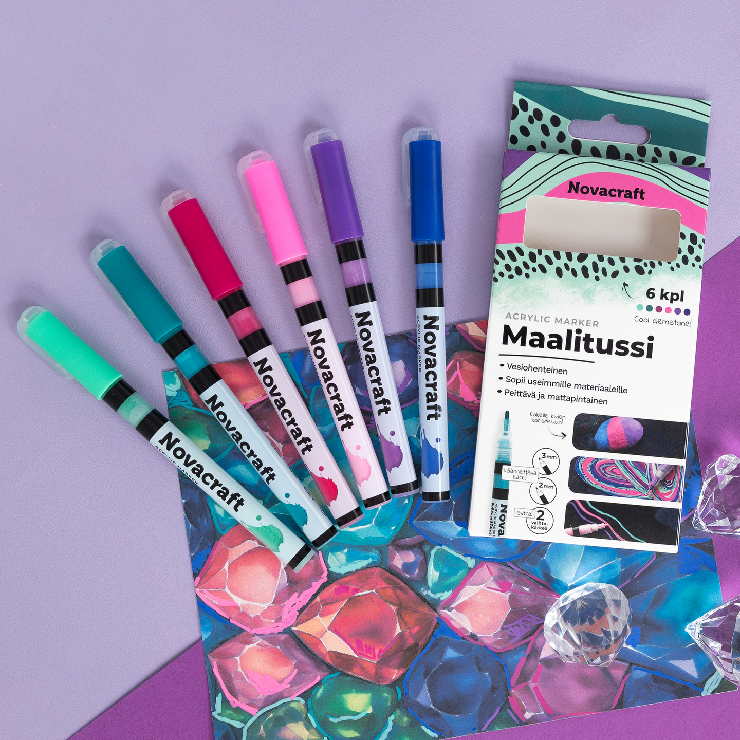 Novacraft akryylipohjainen vesiohenteinen maalitussi - Acrylic Marker. Maalitussit sopivat useimmille materiaaleille mm. paperille, pahville, maalauspohjille, puulle, tekstiileille, kivelle, useimmille muoveille, metallille, lasille ja keramiikalle. Piirtojälki on peittävä ja mattapintainen. Se kuivuu nopeasti ja on kuivuttuaan kestävää huokoisilla pinnoilla. Ei-huokoisilla pinnoilla kiinnitä maali materiaalille sopivalla viimeistelylakalla tai vernissalla. Kankaassa väri pysyy paremmin lämpökiinnityksen jälkeen. Cool Gemstone -värilajitelma sisältää kuusi eri väristä kynää: Vihreä jade, vihreä smaragdi, punainen rubiini, pinkki timantti, violetti ametisti, sininen safiiri. Vinkki! Kokeile kyniä kivien koristeluun.