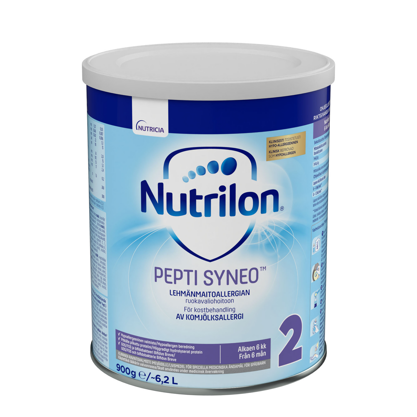 Kliininen ravintovalmiste lehmänmaitoallergian ruokavaliohoitoon, alkaen 6 kk. Allergia on immuunijärjestelmän ylireaktio elintarvikkeisiin tai ympäristöön. Lehmänmaitoallergia on yksi yleisimmistä allergioista imeväisillä ja siihen liittyy immuunireaktio maidon proteiinille.. Nutricialla on yli 120 vuoden kokemus varhaisravitsemuksesta, ja se on ollut edelläkävijä tutkimuksessa 40 vuoden ajan, intohimoisen, yli 500 tutkijan ja asiantuntijan voimin. Tutkimuksemme on auttanut meitä kehittämään Nutrilon Pepti SYNEO™ -valmisteen. Se on suunniteltu vauvoille, joilla on todettu lehmänmaitoallergia. TÄRKEÄÄ: Äidinmaito on imeväisen parasta ravintoa. Nutrilon® Pepti SYNEO 2 -valmistetta on käytettävä hoitavan lääkärin valvonnassa. Voidaan käyttää lapsen ravintona 6 kk:n iästä alkaen kiinteän ruoan ohella tai hoitavan lääkärin ohjeen mukaan, jos äidinmaito ei riitä tai lasta ei imetetä. Vain suun kautta tai syöttöletkulla annettavaksi. Lapsen terveyden kannalta on tärkeää noudattaa tarkoin pakkauksessa olevia valmistus- ja säilytysohjeita.