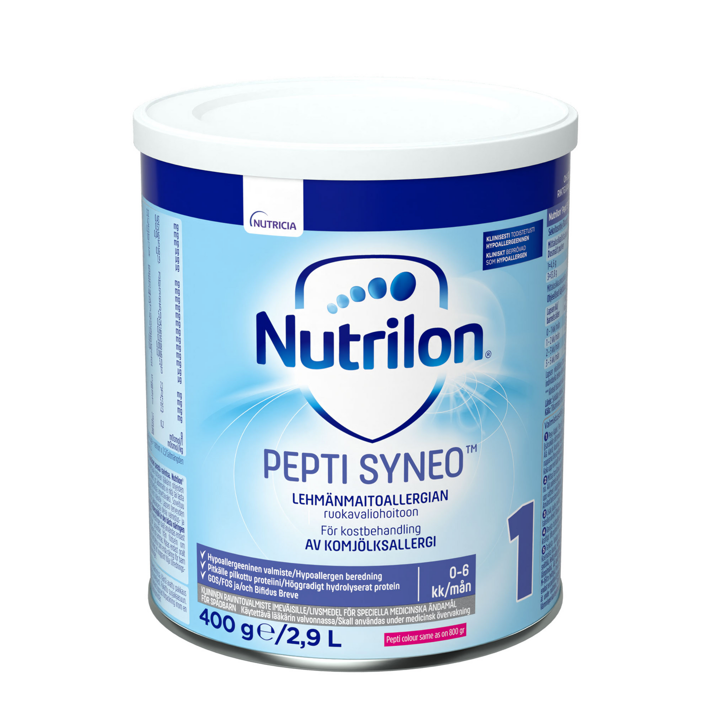 Nutrilon Pepti Syneo 1 on kliininen ravintovalmiste imeväisille lehmänmaitoallergian ruokavaliohoitoon. Allergia on immuunijärjestelmän ylireaktio elintarvikkeisiin tai ympäristöön. Lehmänmaitoallergia on yksi yleisimmistä allergioista imeväisillä ja siihen liittyy immuunireaktio maidon proteiinille. Jos äidinmaito ei riitä tai jos imettäminen ei onnistu, voidaan Nutrilon Pepti SYNEOTM -valmistetta käyttää lapsen ravintona syntymästä alkaen. Soveltuu ainoaksi ravinnoksi alle 6 kk ikäisille. Nutrilon Pepti SYNEOTM -valmistetta käytetään hoitavan lääkärin ohjeiden mukaan. Lapsen terveyden kannalta on tärkeää noudattaa tarkoin pakkauksessa olevia valmistus- ja säilytysohjeita.