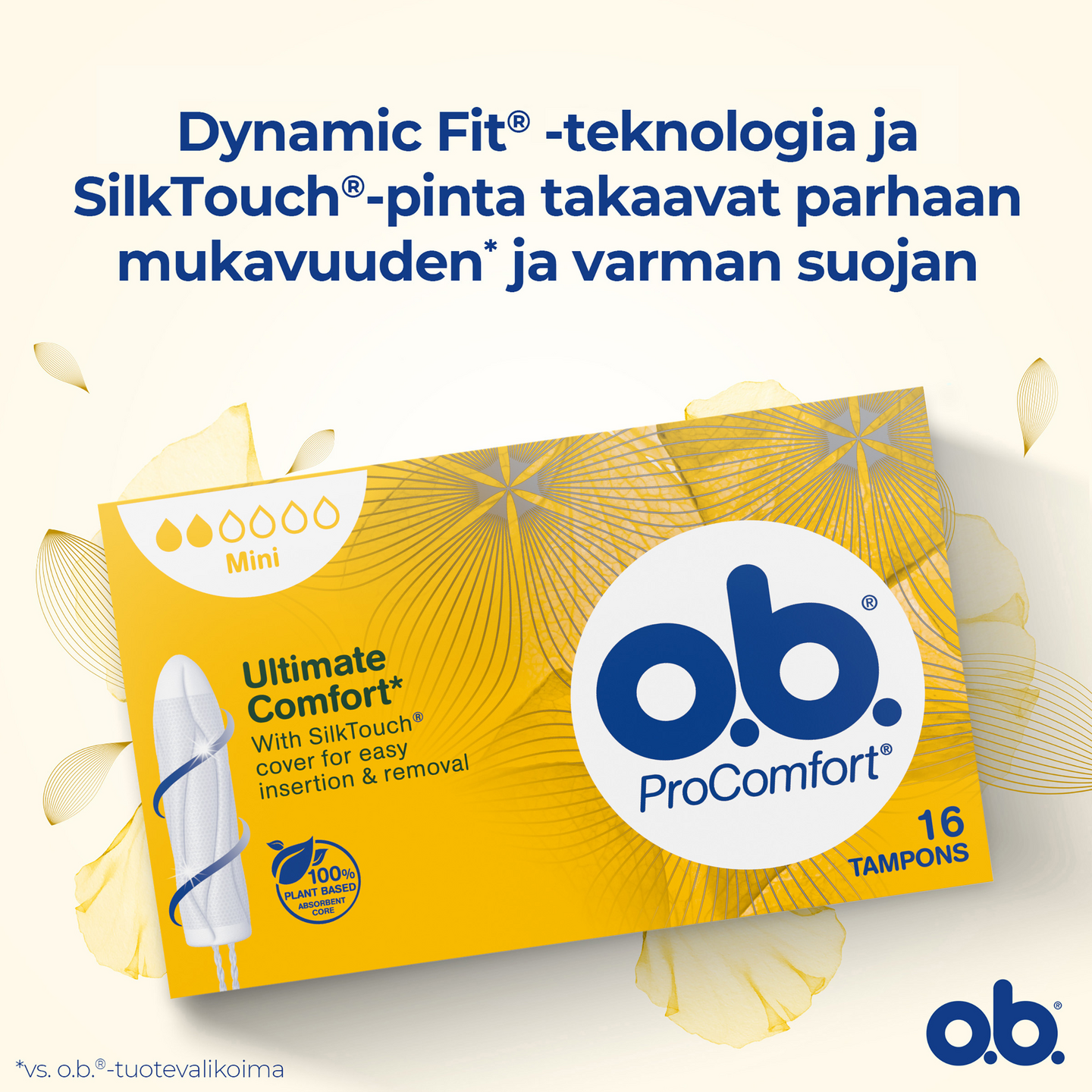 Sileän SilkTouch®-pintansa ja ainutlaatuisten lomittaisten uriensa ansiosta o.b.® ProComfort® Mini -tamponi on helppo asettaa paikalleen, ja se takaa varman suojan. Tamponi on pieni ja kapea, ja sen kapeneva kärki tekee siitä helpon asettaa paikalleen. Jopa 100 % suoja vuotoja vastaan ja luotettava suoja 4-8 tunnin ajan. o.b.® ProComfort® on o.b.®-valikoiman mukavin tamponi, joka tarjoaa luotettavaa suojaa, jotta voit keskittyä tekemään sitä, mitä haluat. o.b.® ProComfort® Mini sopii hyvin sinulle, joka käytät tamponia ensimmäistä kertaa tai kun vuoto on niukkaa.