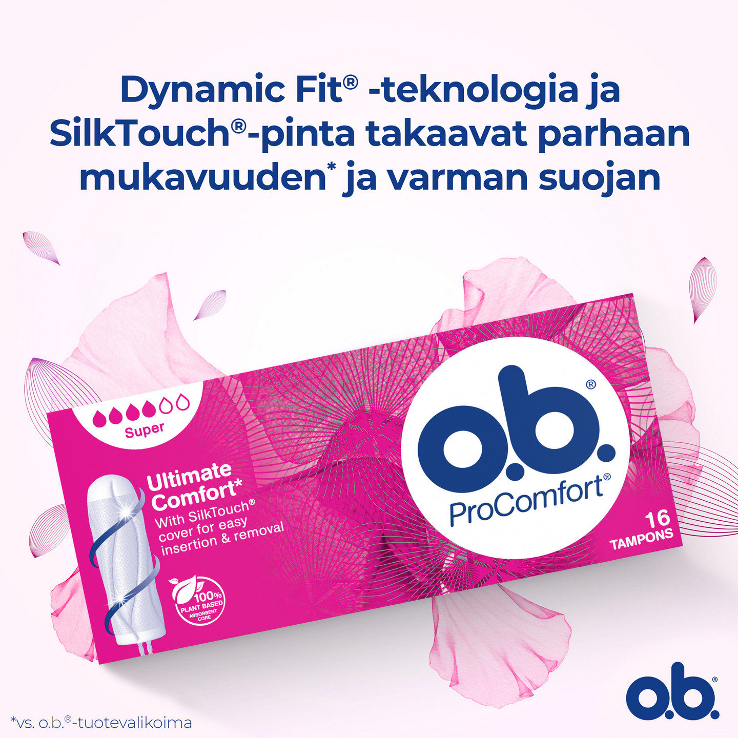 Sileän SilkTouch®-pintansa ja ainutlaatuisten lomittaisten uriensa ansiosta o.b.® ProComfort® Super -tamponi on helppo asettaa paikalleen, ja se takaa luotettavan suojan. Jopa 100 % suoja vuotoja vastaan ja luotettava suoja 4-8 tunnin ajan. o.b.® ProComfort® on o.b.®-valikoiman mukavin tamponi, joka tarjoaa luotettavaa suojaa, jotta voit keskittyä tekemään sitä, mitä haluat. Sopii parhaiten runsaaseen vuotoon.