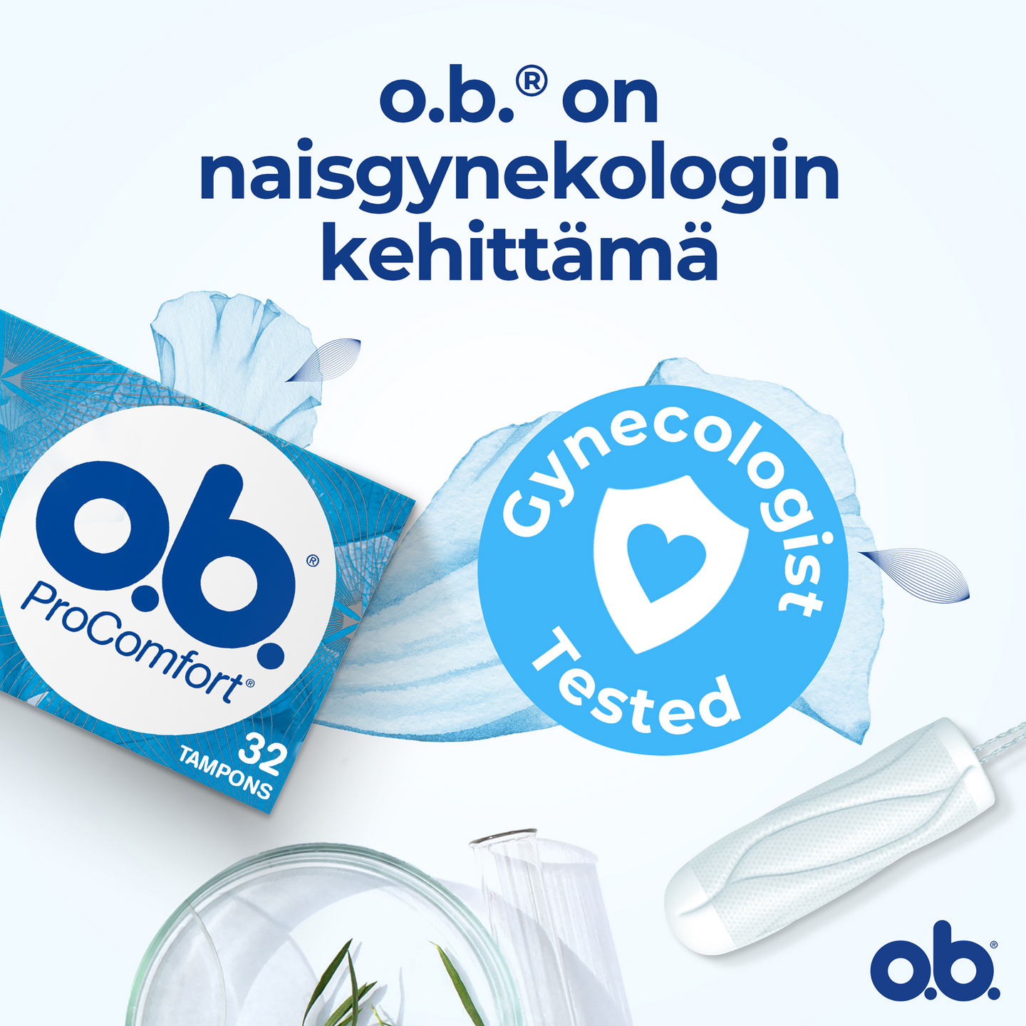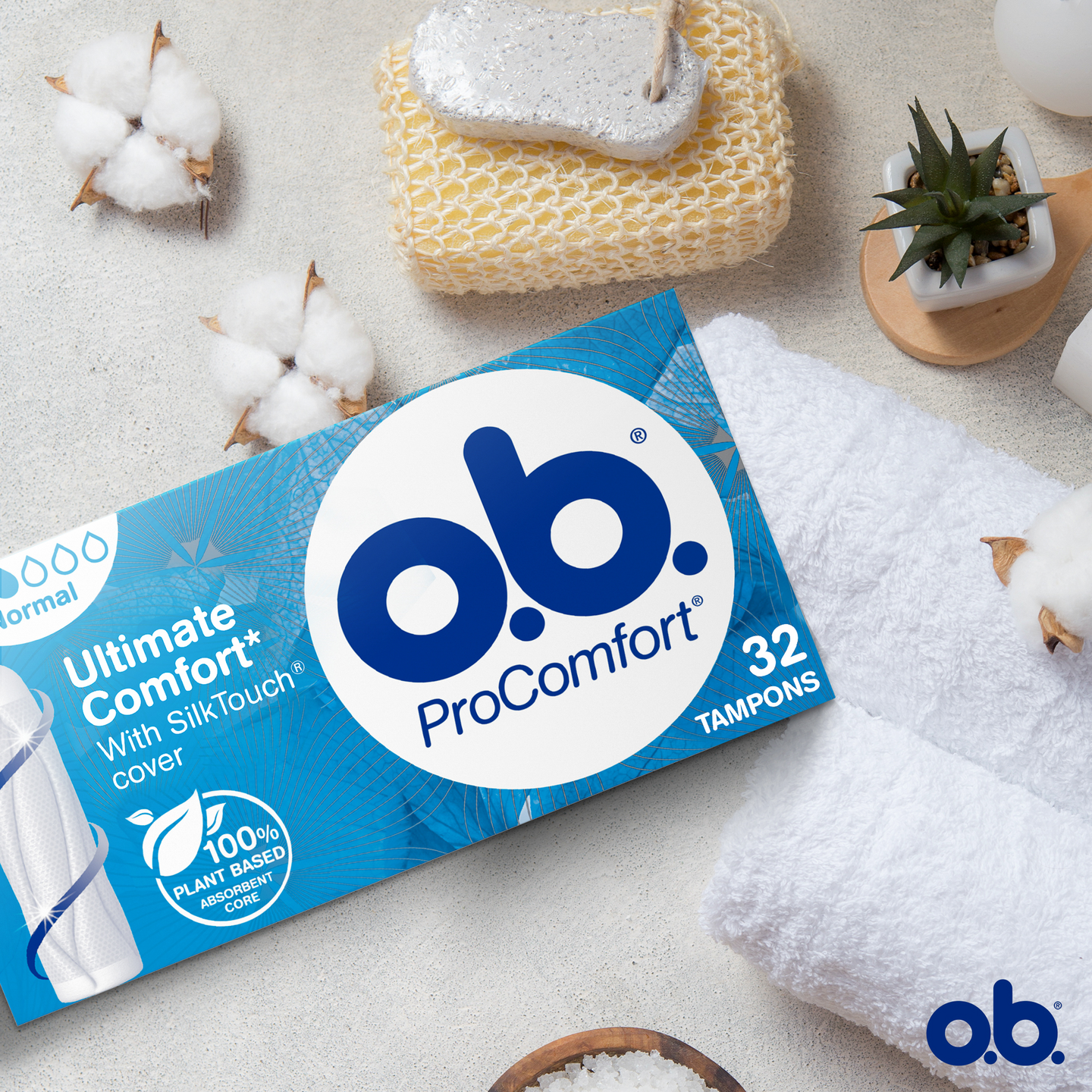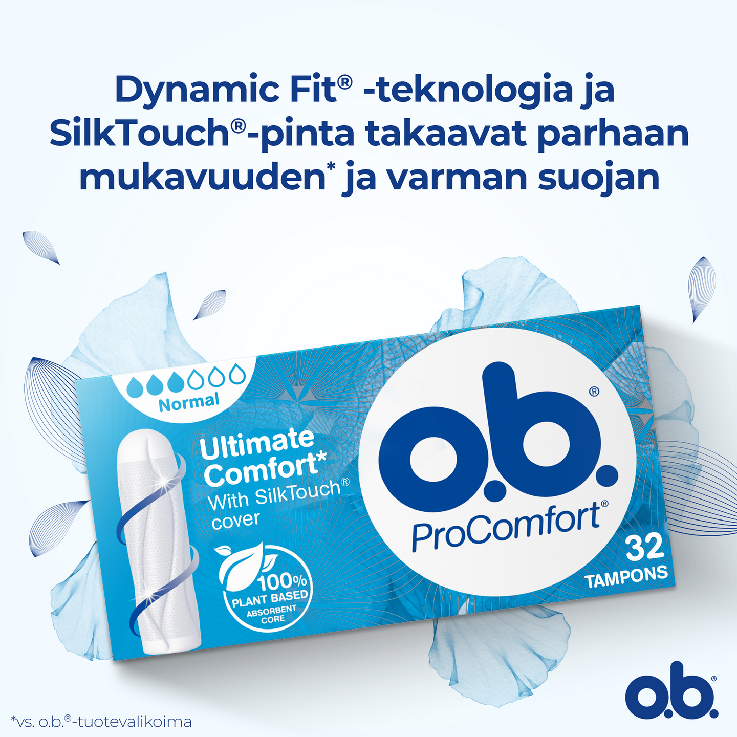 Sileän SilkTouch®-pintansa ja ainutlaatuisten lomittaisten uriensa ansiosta o.b.® ProComfort® Normal -tamponi on helppo asettaa paikalleen, ja se takaa luotettavan suojan. Mukava ja helppokäyttöinen myös päivinä, jolloin vuoto on vähäistä. Jopa 100 % suoja vuotoja vastaan ja luotettava suoja 4-8 tunnin ajan. o.b.® ProComfort® on o.b.®-valikoiman mukavin tamponi, joka tarjoaa luotettavaa suojaa, jotta voit keskittyä tekemään sitä, mitä haluat. Sopii parhaiten normaaliin tai runsaaseen vuotoon.
