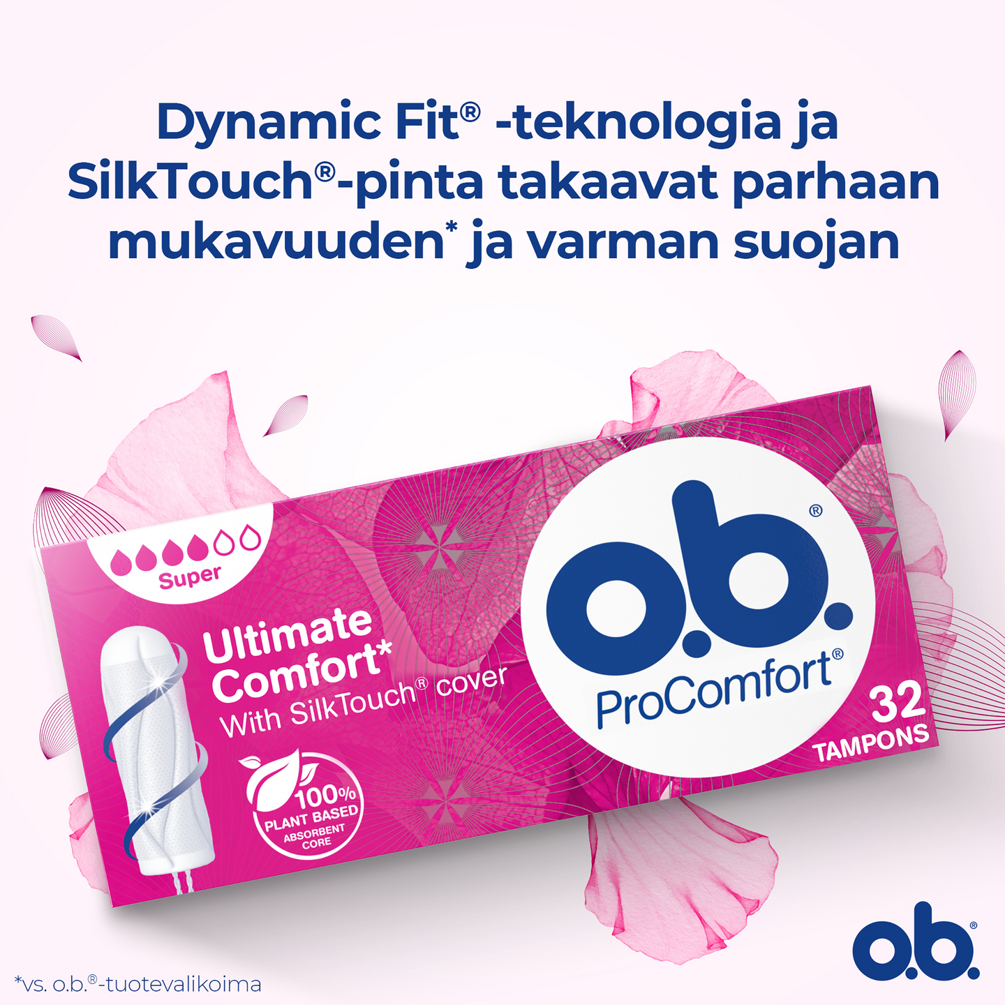Sileän SilkTouch®-pintansa ja ainutlaatuisten lomittaisten uriensa ansiosta o.b.® ProComfort® Super -tamponi on helppo asettaa paikalleen, ja se takaa luotettavan suojan. Jopa 100 % suoja vuotoja vastaan ja luotettava suoja 4-8 tunnin ajan. o.b.® ProComfort® on o.b.®-valikoiman mukavin tamponi, joka tarjoaa luotettavaa suojaa, jotta voit keskittyä tekemään sitä, mitä haluat. Sopii parhaiten runsaaseen vuotoon.