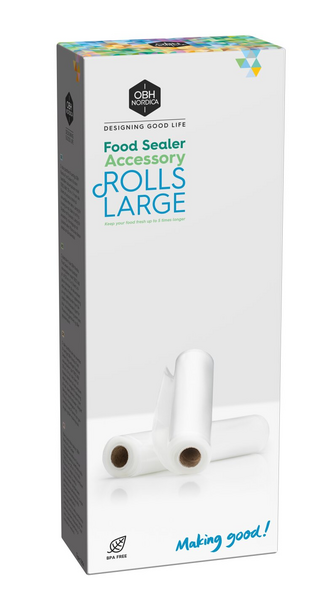 Pussirullat OBH Nordica Food Sealer -tyhjiöpakkauslaitteisiin – voit itse valita pussin koon. Soveltuu elintarvikkeiden lämmittämiseen mikroaaltouunissa sekä poreilevassa vedessä, jonka lämpötila on hieman kiehumispisteen alapuolella.