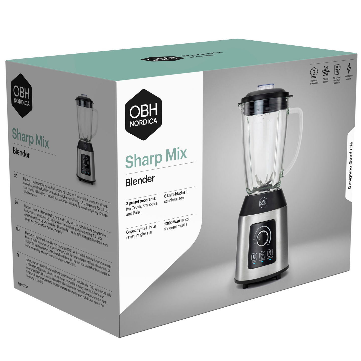 OBH Nordica Sharp Mix on tehokas, ruostumattomasta teräksestä valmistettu tehosekoitin. Sharp Mix -tehosekoittimen avulla valmistat helposti smoothieita, kastikkeita, juomia ja paljon muuta. Sharp Mix -tehosekoittimessa on tehokas 1 000 W:n moottori, joten se voi sekoittaa jäitä sisältävän smoothiesi erinomaisesti. Siinä on helppokäyttöinen paneeli, jossa on kolme pikavalintaohjelmaa: smoothie, jäiden murskaaminen ja sykäystoiminto.