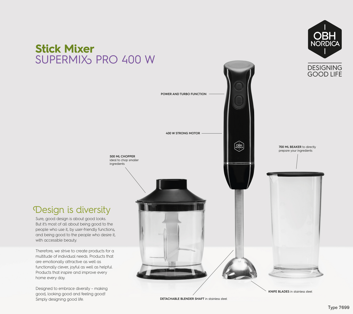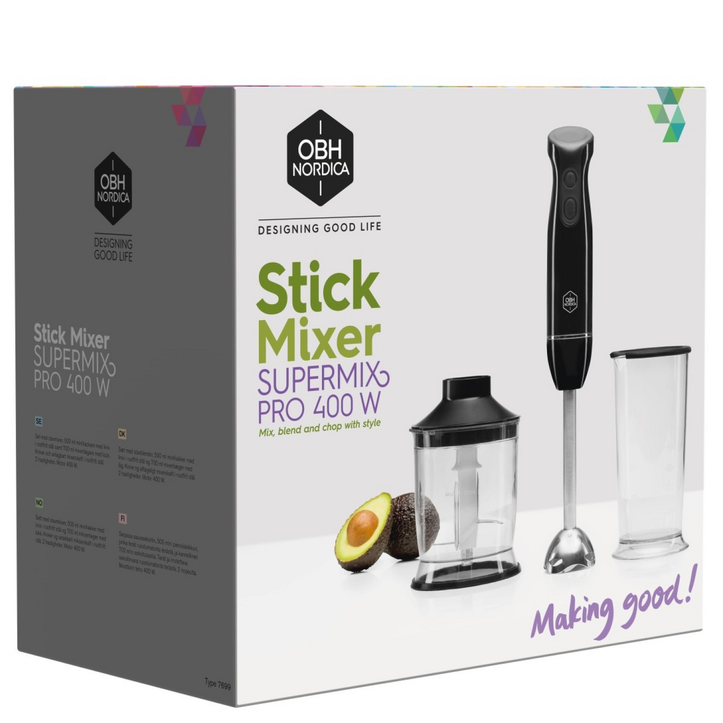 Tyylikäs, kompakti ja tehokas OBH Nordica Super Mix Pro -sauvasekoitinsarja on monipuolinen keittiön apuri. Se sekoittaa helposti keitot, vauvanruoat, smoothiet ja herkulliset soseet muutamassa sekunnissa. Ruostumaton terä vaahdottaa, hienontaa ja sekoittaa vaivatta. Pakkauksessa mukana myös 500 ml:n teholeikkuri mm. sipuleiden, yrttien ja pähkinöiden silppuamiseen. Teholeikkurin terä on ruostumatonta terästä. Mukana myös kannellinen sekoituskulho 700 ml. Irrotettava varsi on ruostumatonta terästä.