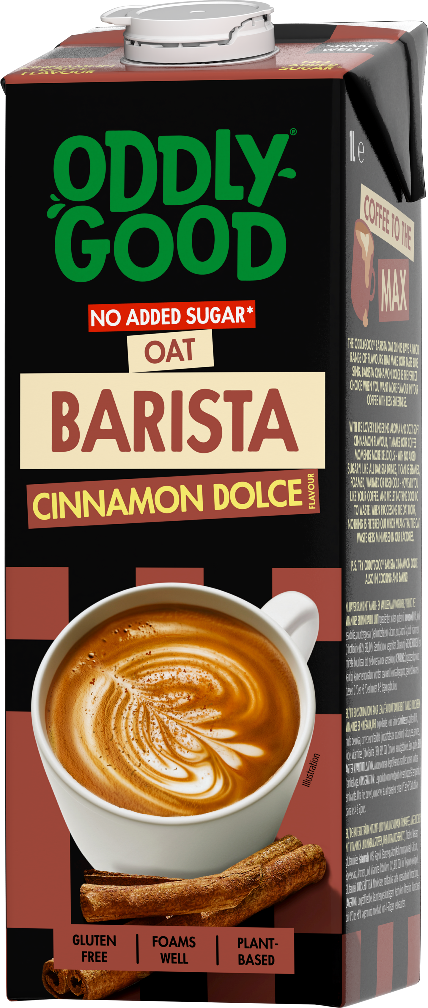 Oddlygood® Barista cinnamon dolce tuo kahviin kauran pehmeyttä ja kanelin maun kodikasta lämpöä, ilman lisättyä sokeria*. Ei lisättyä sokeria* -sarjan maustetut Baristat tuovat kahviin makua vähemmällä makeudella. Saat lempeyttä kahviin ja pehmennettyä makua juuri sopivasti. Muiden Oddlygood® Barista -kaurajuomien tapaan cinnamon dolcea voi käyttää kylmänä tai lämmitettynä, vaahdotettuna tai sellaisenaan kaikenlaisissa kahveissa. Kokeile myös jääkahviin! Sopii vegaaniseen ja gluteenittomaan ruokavalioon. Ravista ennen käyttöä. *Sisältää kauran käsittelyssä syntynyttä sokeria.
