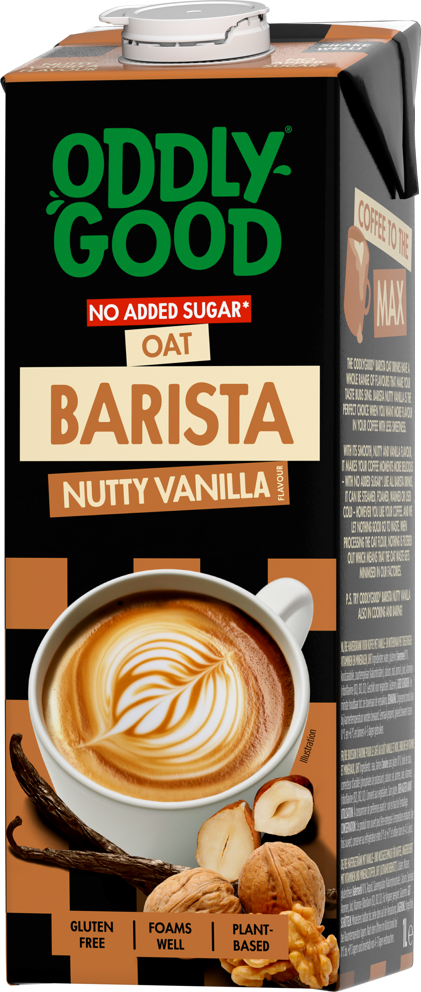 Oddlygood® Barista nutty vanilla on täydellinen valinta, jos haluat kahviisi makua vähemmällä makeudella. Pehmeän pähkinäiseltä ja vaniljaiselta maistuva kaurajuoma tekee kahvihetkestä herkumman, ilman lisättyä sokeria. Lisää kahviin joko sellaisenaan, kuumennettuna tai vaahdotettuna. Oddlygood® Barista kaurajuoma vaahtoutuu kauniisti ja sekoittuu tasaisesti kaikkiin kahvityyppeihin. Kokeile myös jääkahviin! Sopii vegaaniseen ja gluteenittomaan ruokavalioon. Ravista ennen käyttöä.