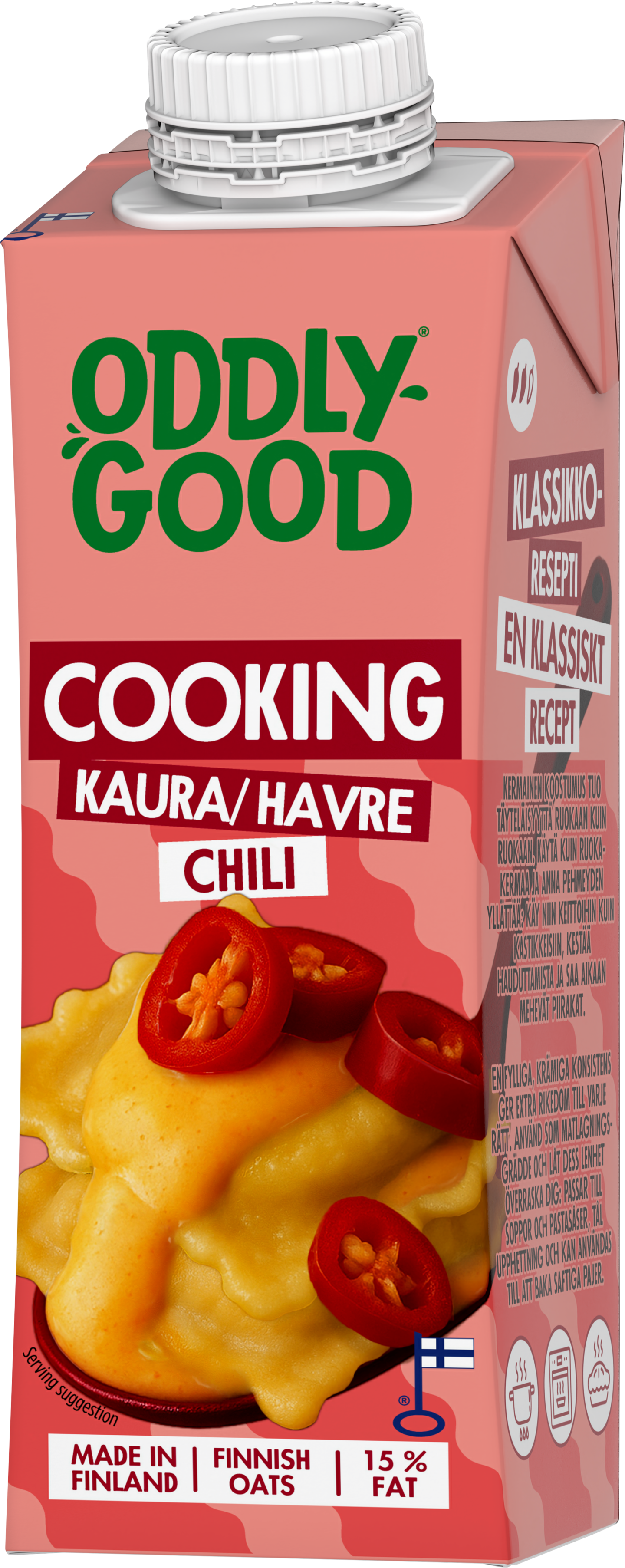 Chilillä maustettu Oddlygood® Cooking Oat Chili tuo ruokaan kauran pehmeyttä pienellä potkulla. Maustetuilla Cooking Oat -tuotteilla saat makua kokkailuun ihanan helposti. Käytä kuin ruokakermaa: lorauta keittoihin ja pastakastikkeisiin tuomaan täyteläistä makua. Tuotteet kestävät hyvin hauduttamista ja niillä teet myös mehevät piirakat. Cooking Oat -tuotteet valmistetaan Suomessa suomalaisesta gluteenittomasta kaurasta. Kokkailemisiin!