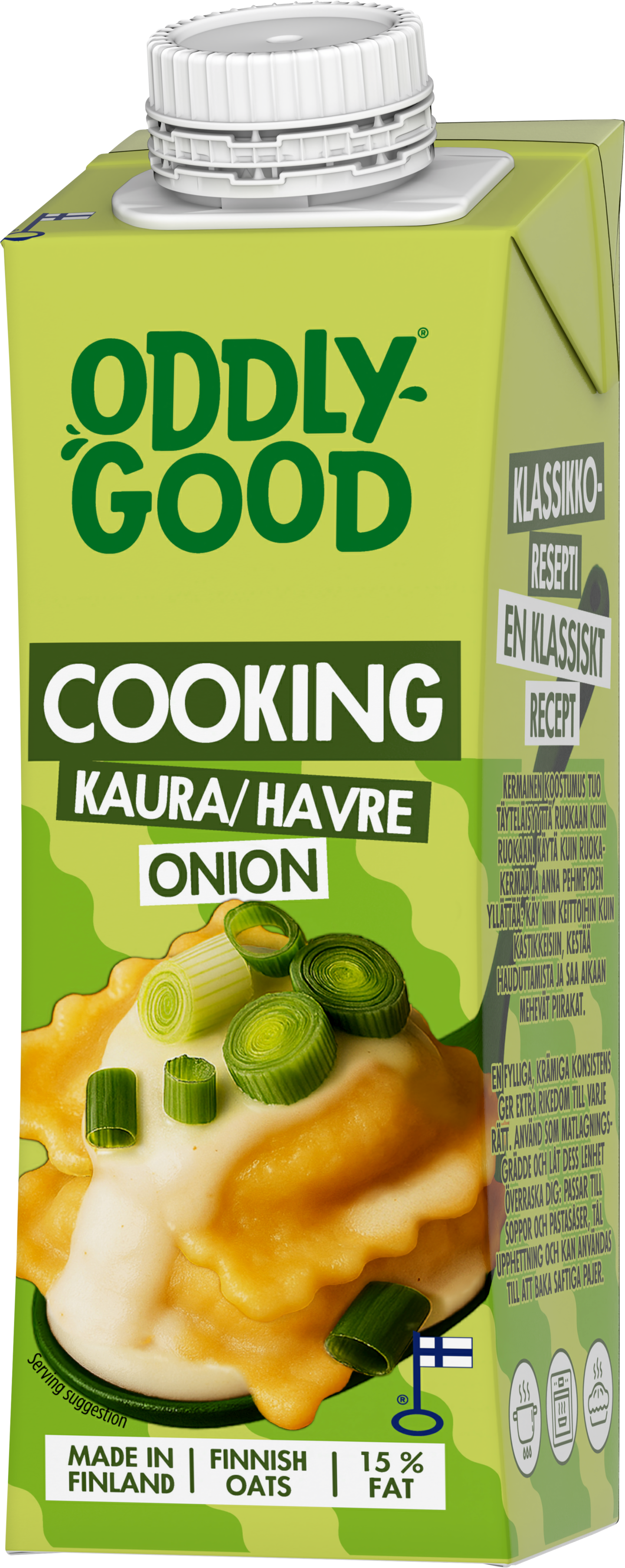 Sipulilla maustettu Oddlygood® Cooking Oat Onion tuo ruokaan lempeää sipulisuutta ja kauran pehmeyttä. Maustetuilla Cooking Oat -tuotteilla saat makua kokkailuun ihanan helposti. Käytä kuin ruokakermaa: lorauta keittoihin ja pastakastikkeisiin tuomaan täyteläistä makua. Tuotteet kestävät hyvin hauduttamista ja niillä teet myös mehevät piirakat. Cooking Oat -tuotteet valmistetaan Suomessa suomalaisesta gluteenittomasta kaurasta. Kokkailemisiin!