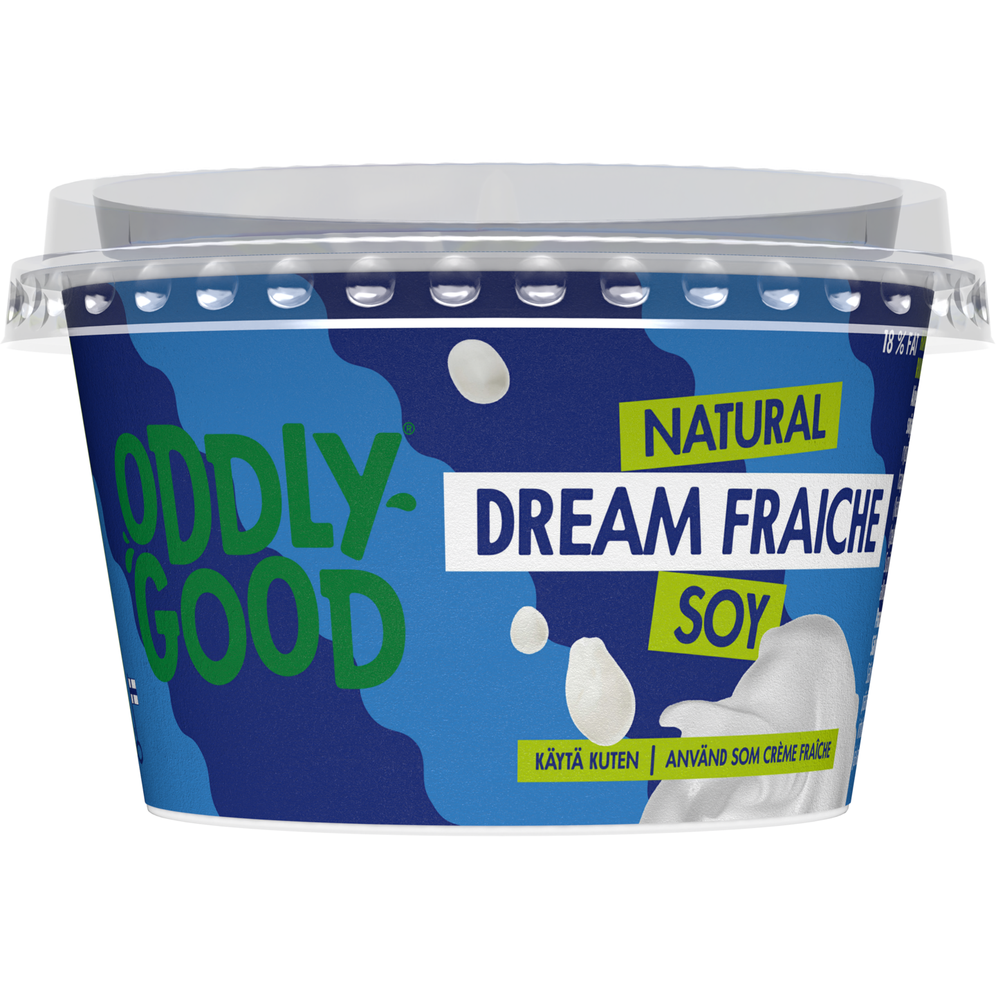 Oddlygood® Dream Fraiche soy natural on unelmiesi täyteläinen kumppani keittiössä, jota voit käyttää kuin crème fraichea. Se tarjoaa miedon hapokkaan maun ja loistavat ruoanlaitto-ominaisuudet, joten se sopii kaikkiin resepteihin, joissa kaipaat herkullista täyteläisyyttä. Käytä lämpimissä tai kylmissä ruoissa ja anna ruokiesi loistaa! Valmistettu Suomessa pohjoisamerikkalaisista soijapavuista, joiden alkuperä on taattu. Vegaaninen, rasvapitoisuus 18 %. Tunnettu aiemmin nimellä Oddlygood® Planti Dream Fraiche soy.