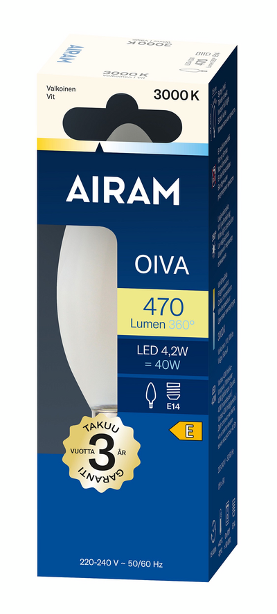 Oiva-sarjan opaali kynttiläkupuinen filamentti led-lamppu, laaja 360° valonjako, 4,2W, värilämpötila puhdas valkoinen 3000K, E14-kanta, 470lm, polttoikä n. 15000h, koko ø 35 x 97 mm, pahvipakkaus. Taajuus ~50/60Hz. Lampulla on täysin ympärisäteilevä valonjako, se sopii hyvin plafondeihin ja pöytävalaisimiin. Toimintalämpötila-alue -20 … +40 °C. Hyvä värintoistoindeksi CRI > 80. Jatkuva tasainen spektri, ei värivääristymiä. Ei UV- tai IR-säteilyä. Ei sisällä elohopeaa. Kolmen vuoden takuu.