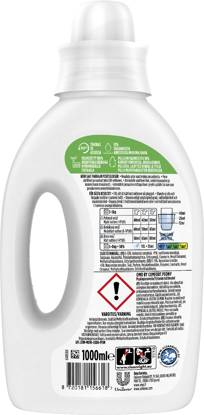 Omon pesuteho ja Comfort huuhteluaineen ihana tuoksu samassa pullossa! Tarjoaa erinomaisen pesutuloksen sekä lumoavan tuoksun vaatteillesi. Poistaa tehokkaasti vaikeatkin tahrat ja antaa puhtaan pesutuloksen joka kerta. Nestemäinen pesuaine soveltuu erinomaisesti myös vaikeiden tahrojen esikäsittelyyn ja käsinpesuun. Ei sisällä huuhteluainetta, vain Comfort -tuoksun. Omo - lika on hyväksi!