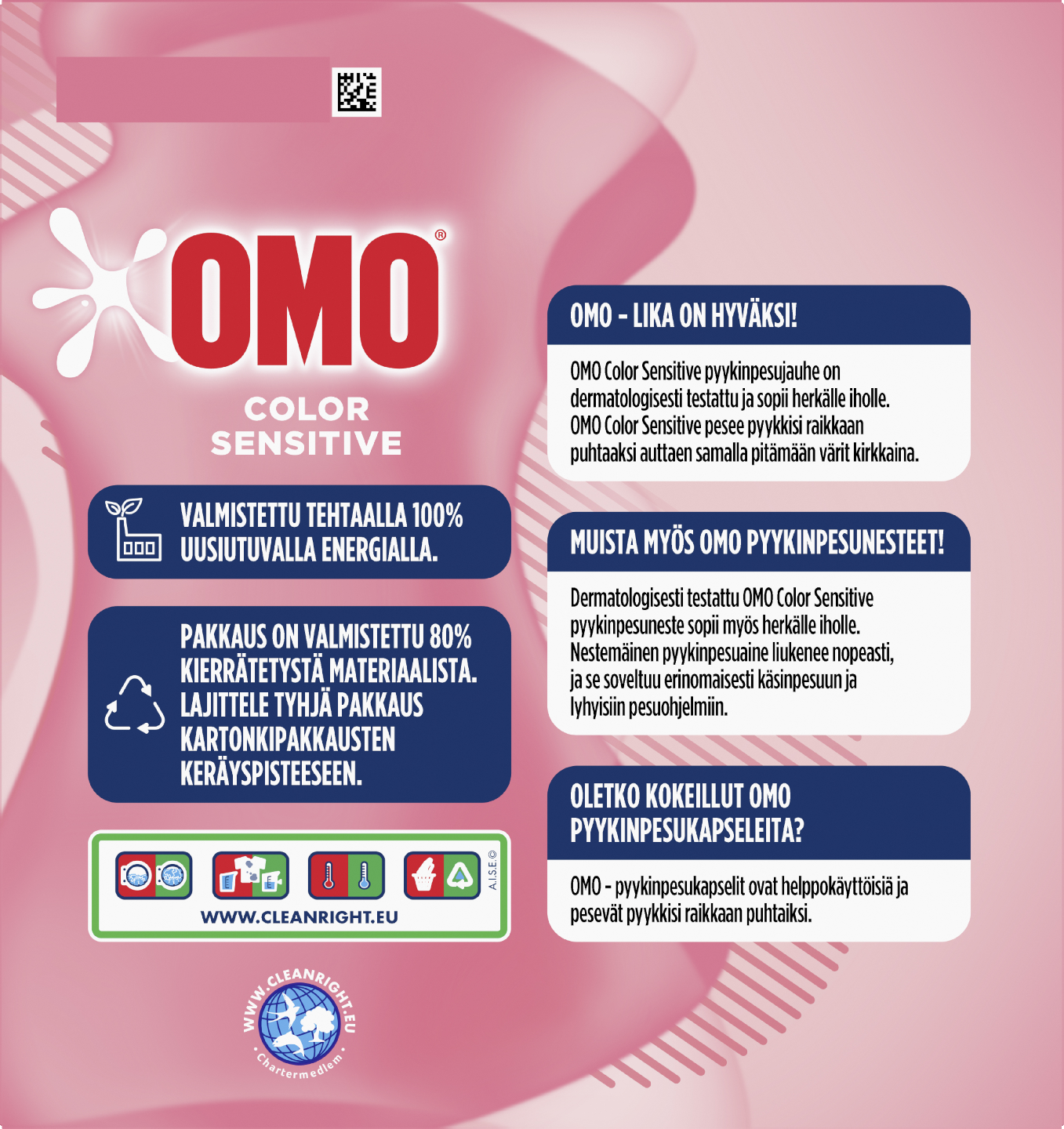 Omo Color Sensitive on pyykinpesujauhe, joka sopii sinulle, jolla on herkästi reagoiva iho, olet allerginen tai pidät muuten vaan hajusteettomasta pesuaineesta. Omo Color Sensitive pesee kuitenkin aivan yhtä tehokkaasti ja antaa aivan yhtä häikäisevän pesutuloksen kuin alkuperäinen Omo Color. Pyykinpesuaine poistaa pyykistäsi tehokkaasti vaikeatkin tahrat. Dermatologisesti testattu Omo Color Sensitive sopii myös herkkäihoisen pyykille sekä pienten lasten kirjavien vaatteiden pesuun. Me rakastamme värejä, minkä vuoksi olemmekin kehittäneet jauhemaisen Omo Colorin Sensitiven herkälle iholle. Se on kirjopesuaine, joka auttaa sinua säilyttämään vaatteesi värit ja saa sen näyttämään raikkaalta pidempään! Jauhemainen pesuaine puhdistaa tehokkaasti vaikeasti likaantuneen kirjopyykin ja poistaa tahrat. Jauhemainen Omo Color Sensitive -pyykinpesujauhe ei sisällä valkaisuainetta, joten se puhdistaa vaatteet hellävaroen. Omo Color Sensitive on pyykinpesuaine, joka on tehokas myös matalissa pesulämpötiloissa ja pikapesuohjelmissa. Omo sensitive Color -pyykinpesujauhe valmistetaan pohjoismaisessa tehtaassa, joka käyttää 100 % uusiutuvaa energiaa. Omo – Lika on hyväksi! Ole tiukka tahroille – ja ystävällisempi ympäristölle. Globaalina kotitalousbrändinä meidän on sitouduttava toimimaan oikein. Siksi tutkimme tarkkaan, mistä raaka-aineemme ovat peräisin. Kyseenalaistamme tarpeen vaatiessa tuotantomenetelmämme parantaaksemme tuotteitamme ja suojellaksemme ympäristöä. Haluamme varmistaa, että pesuaineemme – jauheemme, nesteemme ja tablettimme – tekevät arjesta helpompaa. Lisäksi haluamme, että ne ovat parempia ympäristölle. Näin vähennämme ympäristövaikutustamme vaarantamatta kuitenkaan tuotteidemme laatua. Kaikki pakkauksemme ovat 100 % kierrätettäviä, ja suurin osa pulloistamme on tehty 97 % kierrätetystä muovista. Lisäksi kartonkipakkauksemme ovat 100 % kierrätettyä kuitua.