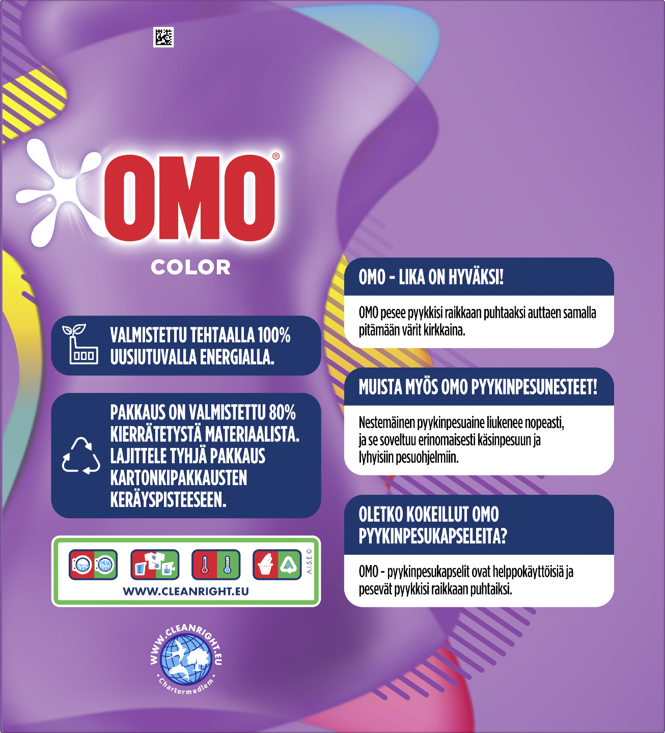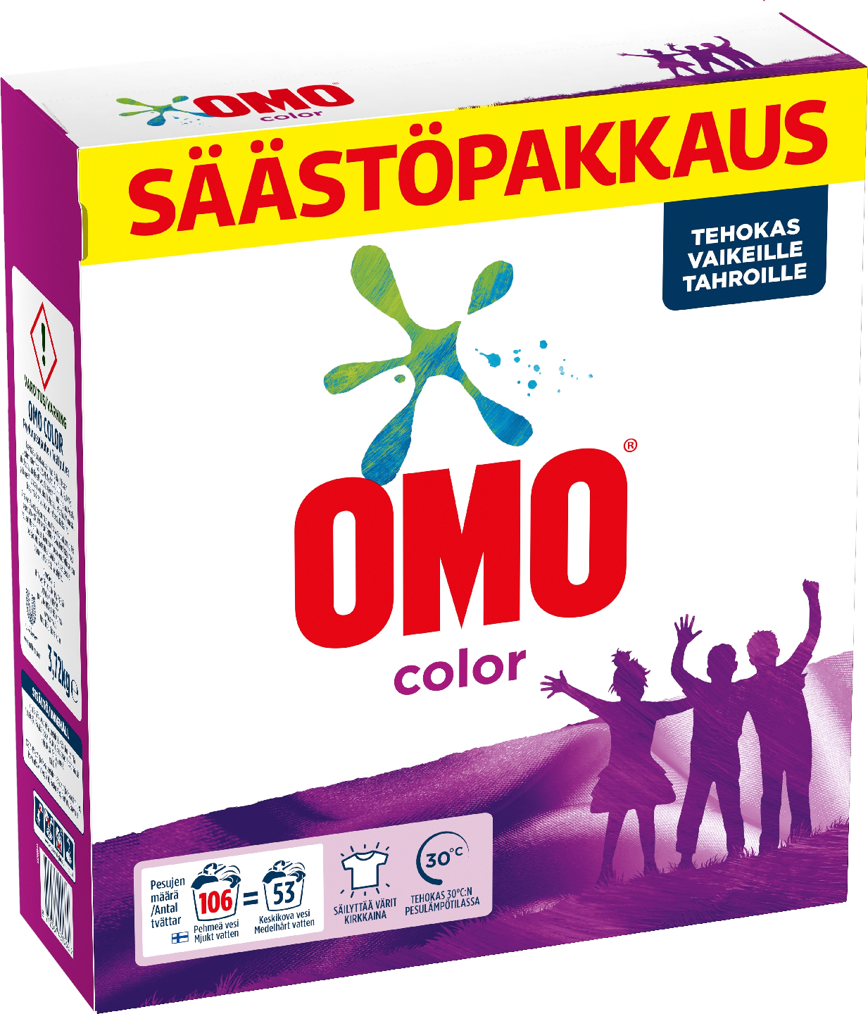 Me rakastamme värejä, minkä vuoksi olemme kehittäneet jauhemaisen Omo Colorin. Se auttaa sinua säilyttämään vaatteidesi värit ja saa ne näyttämään raikkaalta pidempään! Jauhemainen pesuaine pesee tehokkaasti vaikeasti likaantuneen pyykin ja poistaa tahrat. Jauhemainen Omo Color ei sisällä valkaisuainetta, joten se pesee hellävaroen ja auttaa pitämään värillisten tekstiilien värit kirkkaina. Värillisille vaatteille tarkoitettu pesuaineemme on tietenkin saatavana myös herkälle iholle sopivampana Sensitive-versiona. Omo Color -pyykinpesujauhe on tehokas myös matalissa pesulämpötiloissa ja pikapesuohjelmissa. Se soveltuu erinomaisesti myös vaikeiden tahrojen esikäsittelyyn ja käsinpesuun. Omo Color -pesuaine valmistetaan pohjoismaisessa tehtaassa, joka käyttää 100 % uusiutuvaa energiaa. Omo Color pesuaineen edut: Tehokas vaikeille tahroille. • Säilyttää vaatteen värit. • Tehokas 30 °C:ssa. • Tehokas lyhyissä pesuohjelmissa • Valmistettu tehtaassa, joka käyttää 100 % uusiutuvaa energiaa. Omo – Lika on hyväksi! Ole tiukka tahroille – ja ystävällisempi ympäristölle. Kestävyys huolestuttaa meitä kaikkia yhä enemmän. Siksi me Omolla tutkimme tarkkaan, mistä raaka-aineemme ovat peräisin, ja kyseenalaistamme tuotantomenetelmämme parantaaksemme tuotteitamme ja suojellaksemme planeettaamme. Haluamme varmistaa, että pesuaineemme – jauheemme, nesteemme ja tablettimme – tekevät arjesta helpompaa. Lisäksi haluamme, että ne ovat parempia ympäristölle. Näin vähennämme ympäristövaikutustamme vaarantamatta kuitenkaan tuotteidemme laatua. Kaikki pakkauksemme ovat 100 % kierrätettäviä, ja suurin osa pulloistamme on tehty 97 % kerrätetystä muovista. Lisäksi kartonkipakkauksemme ovat 100 % kierrätettyä kuitua.