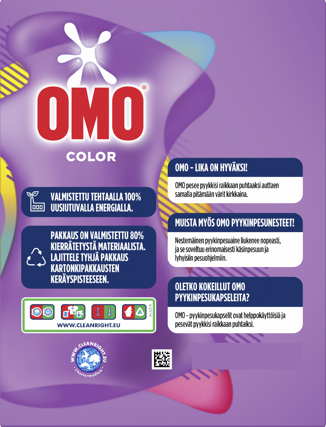 OMO Color Pyykinpesujauhe on kehitetty huolehtimaan vaatteen väreistä ja saa ne näyttämään hyvältä pidempään! Jauhemainen pesuaine puhdistaa tehokkaasti vaikeasti likaantuneen pyykin ja poistaa tahrat. Jauhemainen OMO Color ei sisällä valkaisuainetta, joten se puhdistaa vaatteet hellävaroen.
