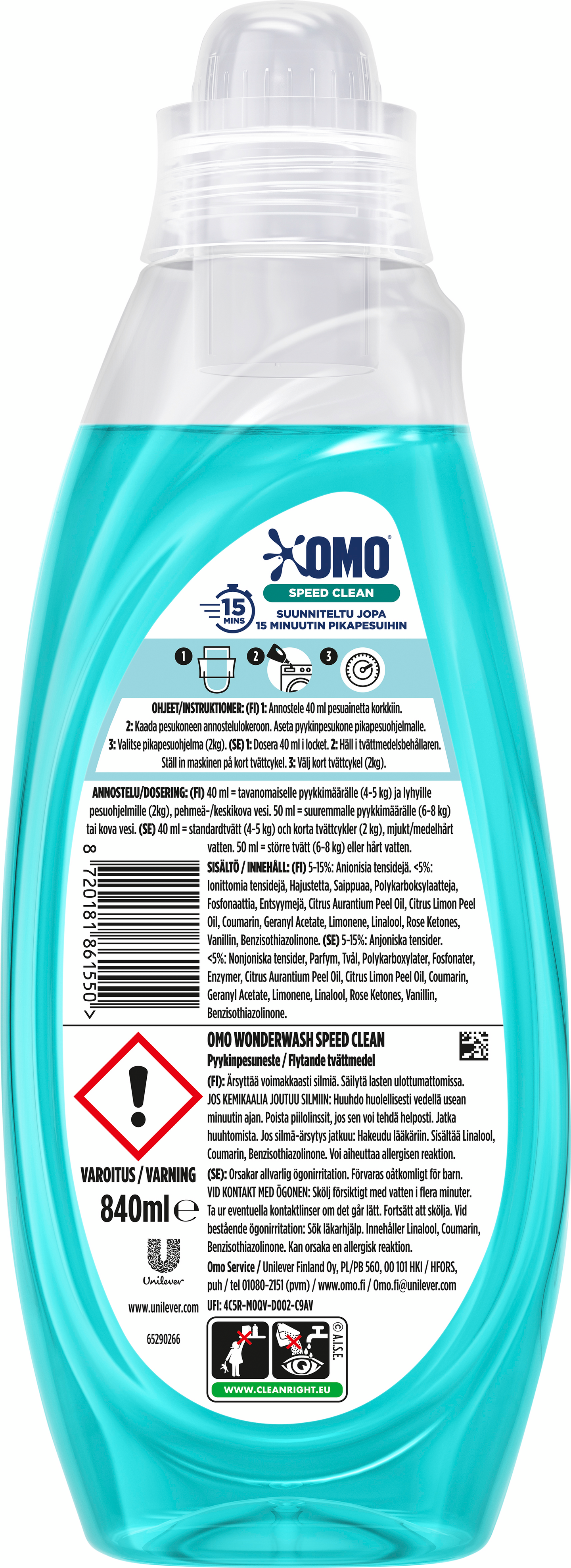 Etsitkö pyykinpesunestettä, joka sopii pikapesuohjelmiin? Kaipaako vaatteesi nopeaa raikastusta ja toivotko niihin pysyvää tuoksua? Omo Wonder Wash Speed Clean on ensimmäinen pyykinpesunesteemme, joka on suunniteltu toimimaan erinomaisesti myös lyhyemmissä pikapesuohjelmissa ja puhdistamaan tehokaasti jopa 15 minuutissa. Sano hyvästit näkymättömälle lialle ja hielle, sillä nopeasti vaikuttava koostumuksemme, joka on varustettu PRO-S teknologialla * poistaa näkymätöntä likaa, hikeä ja pahaa hajua vaatteista ja jättää jälkeensä raikkaan ja kestävän tuoksun. Omo Wonder Wash Speed Clean pyykinpesunesteen tuoksussa on elegantteja ja raikkaita elementtejä, jotka ovat saaneet inspiraationsa hienoista parfyymeista. Lyhyt pikapesuohjelma ja Omo Wonder Wash Speed Clean pyykinpesuneste on hyvä tapa säästää aikaa arjen kiireessä samalla, kun vaatteistasi tulee hetkessä puhtaita ja raikkaita. Omo – Lika on hyväksi! Ole tiukka tahroille – ja ystävällisempi ympäristölle. Haluamme varmistaa, että pesuaineemme – jauheemme, nesteemme ja kapselimme – tekevät arjesta helpompaa. Käyttöohje: Kaada 40 ml Omo Wonder Wash Speed Clean pyykinpesunestettä pyykinpesukoneesi pesuainelokeroon tavallisiin (4-5 kg) koneellisiin ja pikaohjelmiin (2 kg) tai kun peset pehmeällä tai keskikovalla vedellä. Käytä 50 ml pyykinpesunestettä suurempiin (6-8 kg) koneellisiin tai kun peset kovalla vedellä. Otathan ensimmäisenä huomioon vaatteen oman pesu- ja hoito-ohjeen. Kokeile pesuainetta aina ensiksi huomaamattomaan kohtaan ennen kuin esikäsittelet uusia värillisiä vaatteita pyykinpesunesteellä. Älä käytä tuotetta silkki- tai villavaatteisiin. *PRO-S teknologia on patentoitu ja suojattu tavaramerkillä.