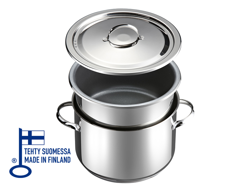 Teräskattilaa voi käyttää myös erikseen tavallisena kattilana ja haudeosaa vaikkapa uunivuokana. Kansi sopii sekä kattilaan että haudeosaan. Haudekattilassa on kolmikerrospohja, se sopii kaikille liesityypeille, myös induktiolle. HUOM! Tarkista oman induktiolietesi valmistajan käyttöohjeista minkä kokoinen astia sopii parhaiten liedellesi. Pinnoitettu haudeosa on käsinpestävä, teräksinen pohjakattila tiskikonepestävä.