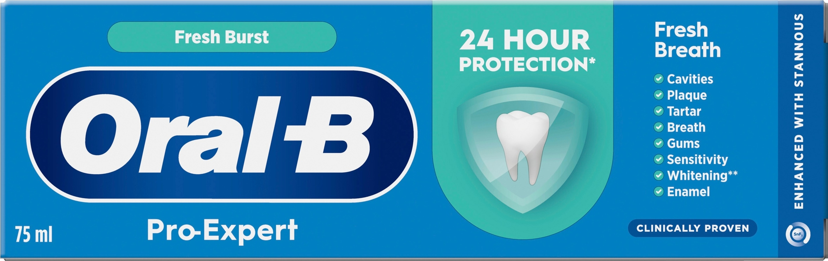 Oral-B Pro-Expert Fresh Breath -hammastahna on kliinisesti tutkittu: se antaa 24 tunnin suojan, kun sitä käytetään kahdesti päivässä. Antibakteerinen teknologia ja tinafluoridiyhdiste muodostavat suojaavan kerroksen, joka auttaa vähentämään plakkibakteerien kasvua myös harjausten välillä. Piparmintun, vihermintun, mentolin ja vaniljan vivahteiden yhdistelmä antaa puhdasta raikkautta
