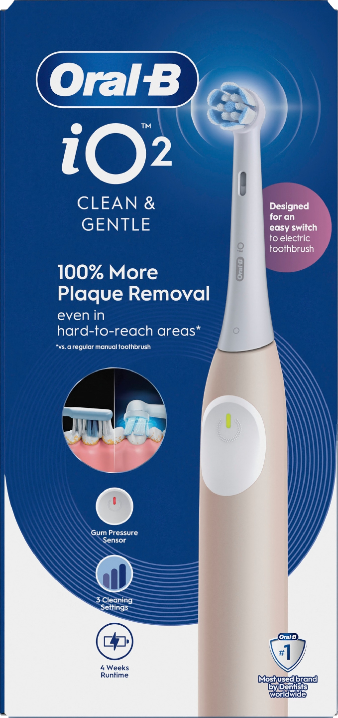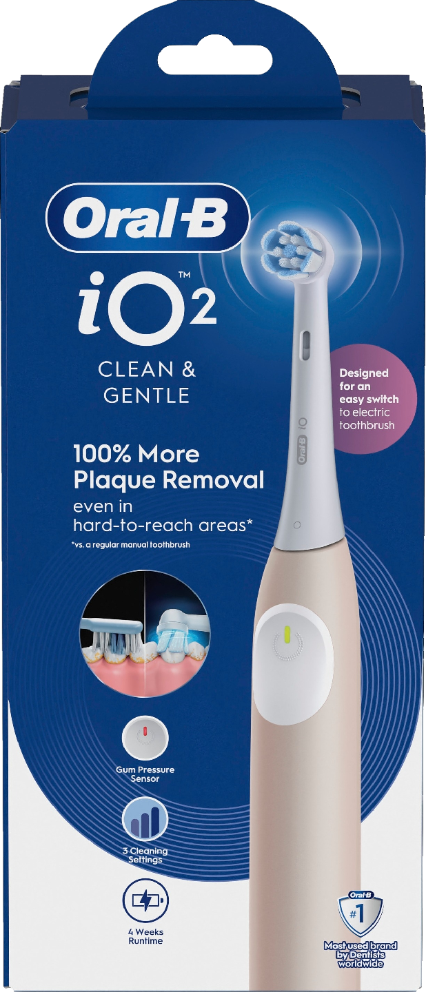 Oral-B iO 2 -sähköhammasharja yhdistää ainutlaatuisen, hammaslääkärien innoittaman pyöreän harjaspään hellävaraiseen mikrovärähtelyyn antaen ammattimaisen puhtaan tunteen joka päivä. Vaihda Oral-B iO -vaihtoharja kolmen kuukauden välein parhaan puhdistustehon säilyttämiseksi.