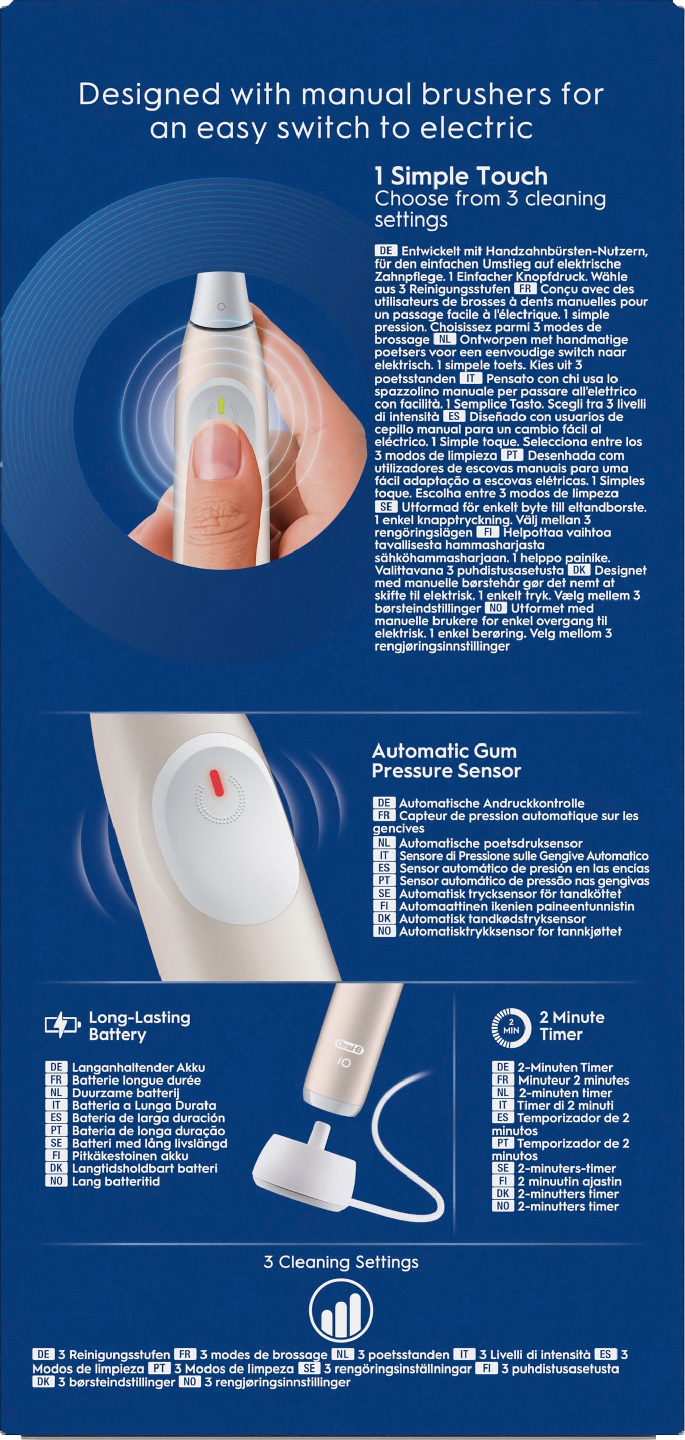 • 100 % puhtaammat hampaat kuin tavallisella käsikäyttöisellä hammasharjalla Oral-B:n iO-tekniikan ansiosta: armoton plakille, hellävarainen ikenille