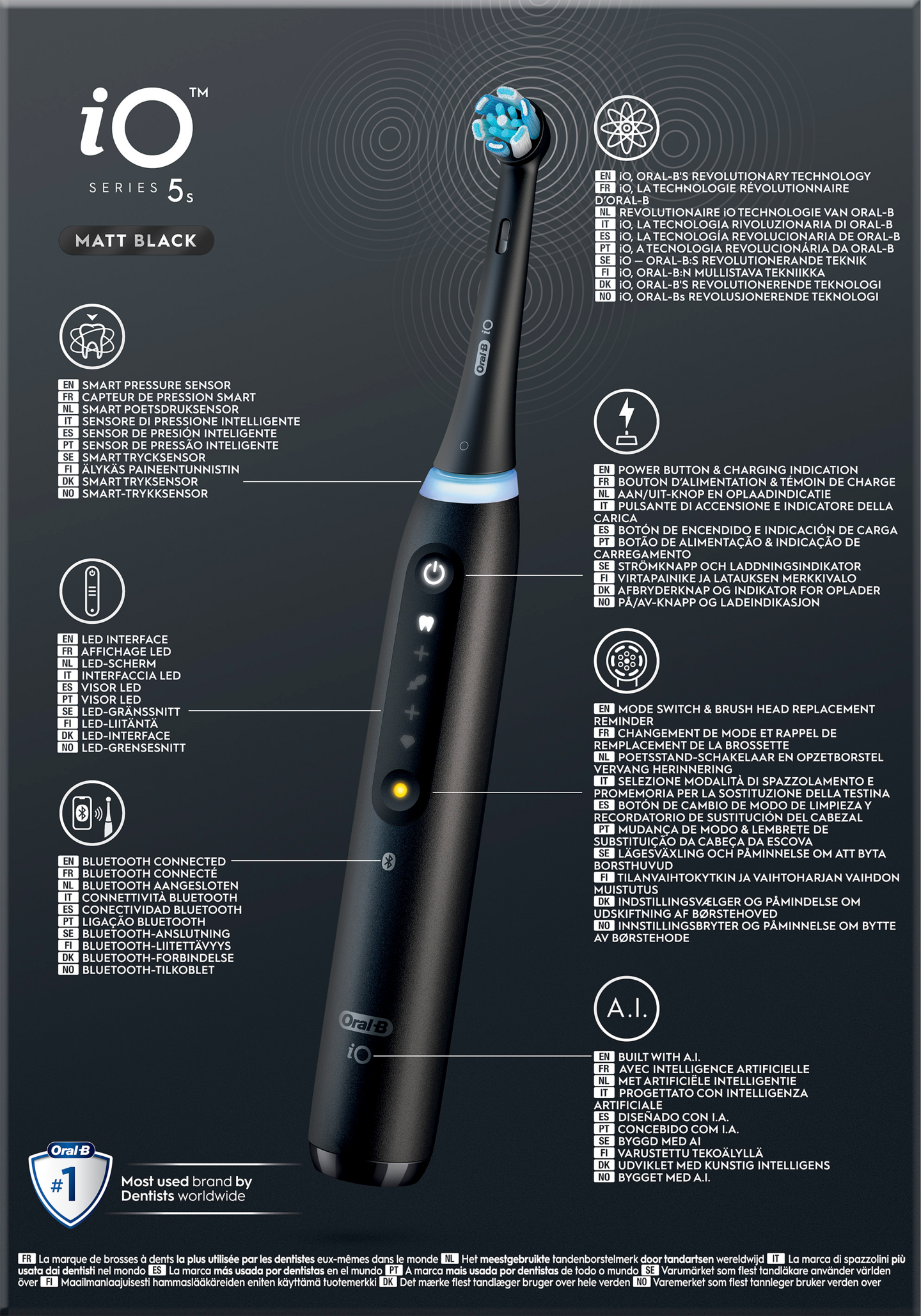 • Pakkauksen sisältö: 1 iO5-runko-osa, 1 vaihtoharja, 1 matkakotelo, 1 laturi, 1 vaihtoharjan pidike