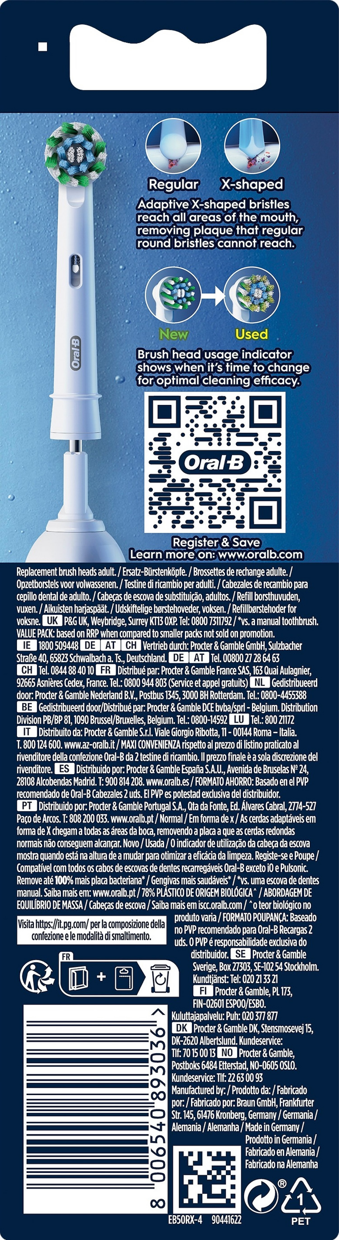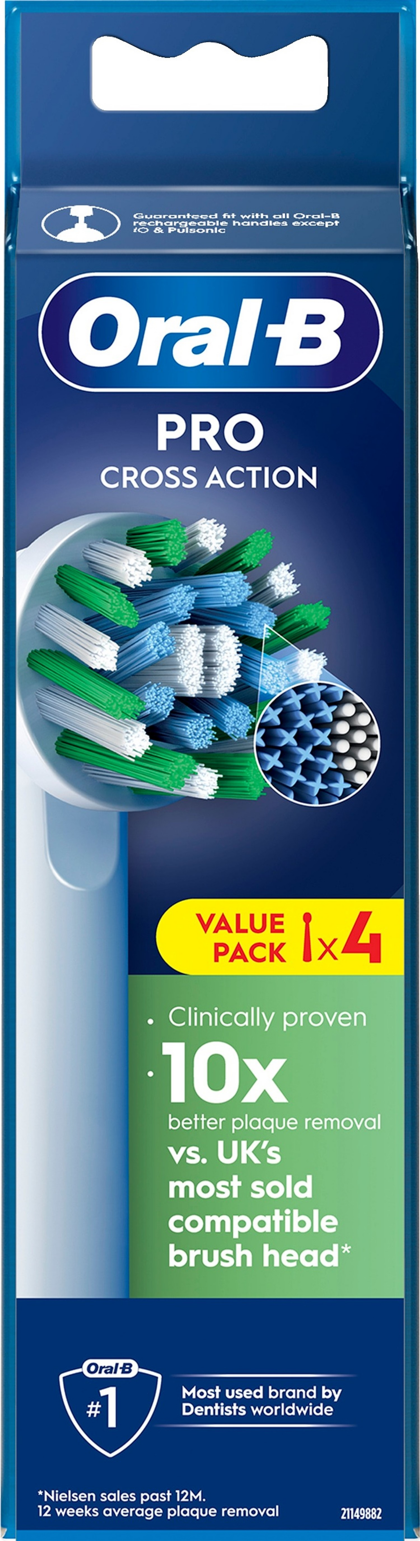 Oral-B Pro Cross Action -harjaspään yli 2 200 täydelliseen kulmaan asetettua harjasta poistaa jopa 100 % enemmän plakkia, jotta saat puhtaammat hampaat ja terveemmät ikenet verrattuna käsikäyttöiseen hammasharjaan. Aidoissa Oral-B-harjaspäissä on uudet X:n muotoiset harjakset, jotka puhdistavat alueet, joihin pyöreät harjakset eivät yllä. Harjaspään kulumisen ilmaisin muuttaa harjakset vihreästä keltaiseksi, kun on aika vaihtaa harjaspää, mikä takaa aina 100 % puhdistustehon. Yhteensopiva ladattavien Oral-B-sähköhammasharjojen kanssa Pulsonic- & iO-sähköhammasharjoja lukuun ottamatta.