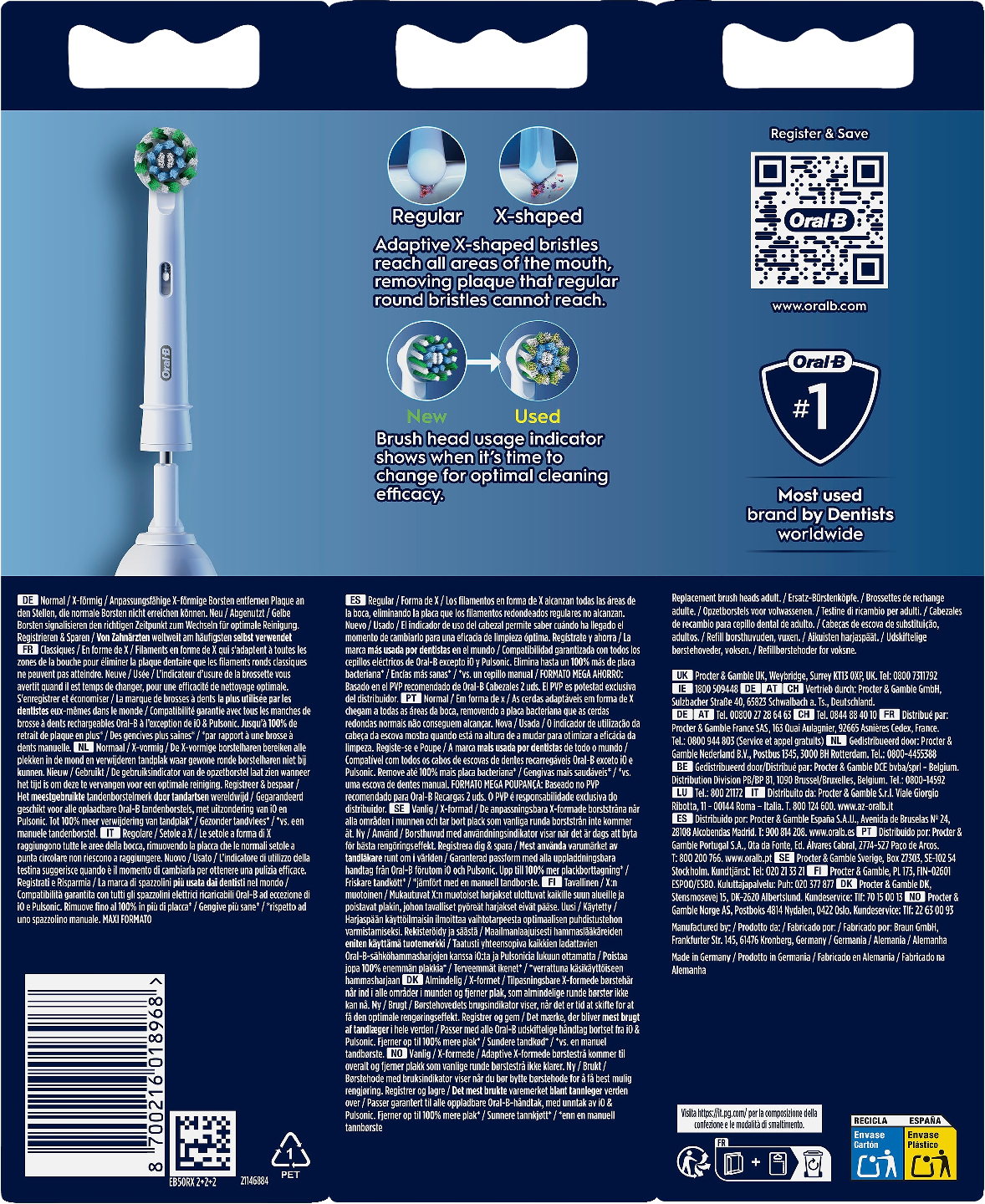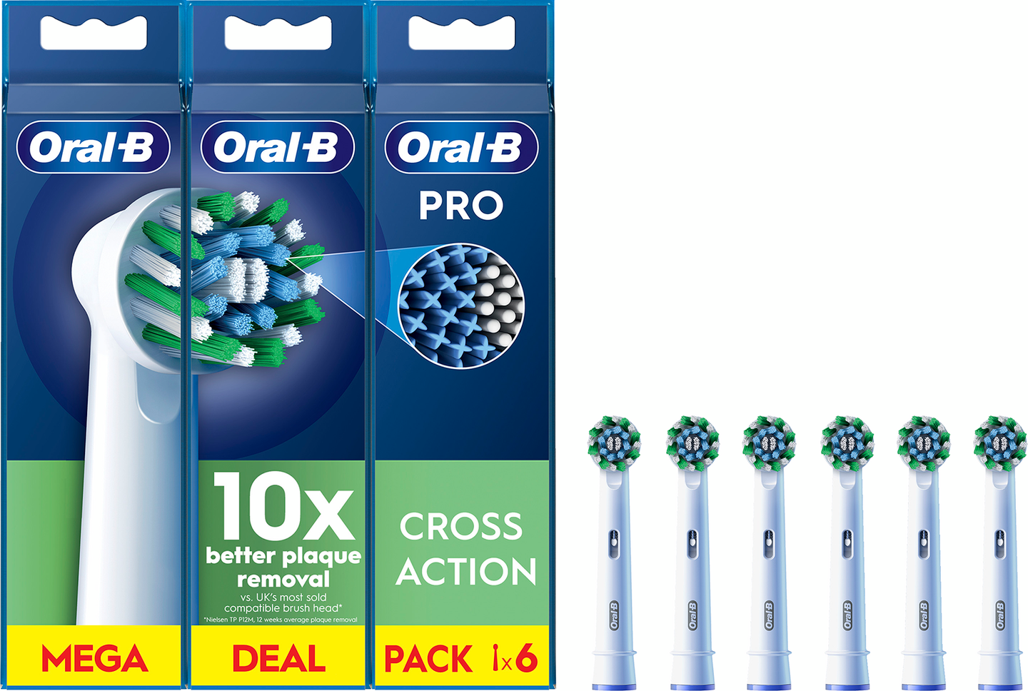 Oral-B Pro Cross Action -harjaspään yli 2 200 täydelliseen kulmaan asetettua harjasta poistaa jopa 100 % enemmän plakkia, jotta saat puhtaammat hampaat ja terveemmät ikenet verrattuna käsikäyttöiseen hammasharjaan. Aidoissa Oral-B-harjaspäissä on uudet X:n muotoiset harjakset, jotka puhdistavat alueet, joihin pyöreät harjakset eivät yllä. Harjaspään kulumisen ilmaisin muuttaa harjakset vihreästä keltaiseksi, kun on aika vaihtaa harjaspää, mikä takaa aina 100 % puhdistustehon. Yhteensopiva ladattavien Oral-B-sähköhammasharjojen kanssa Pulsonic- & iO-sähköhammasharjoja lukuun ottamatta.