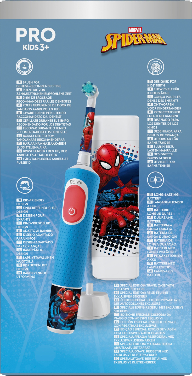 Oral-B Pro Kids sähköhammasharja, jota hammaslääkärit suosittelevat yli 3-vuotiaille lapsille, puhdistaa hellävaraisesti ja tehokkaasti. Harjassa on kaksi harjaustilaa, mukaan lukien ainutlaatuinen, lapsille tarkoitettu hellävarainen tila, ja se puhdistaa lasten hampaat hellävaraisesti. Poistaa enemmän plakkia kuin tavallinen käsikäyttöinen hammasharja.Harjan mukana tulee värikäs matkakotelo, jota lapsesi haluavat aina pitää silmällä.
