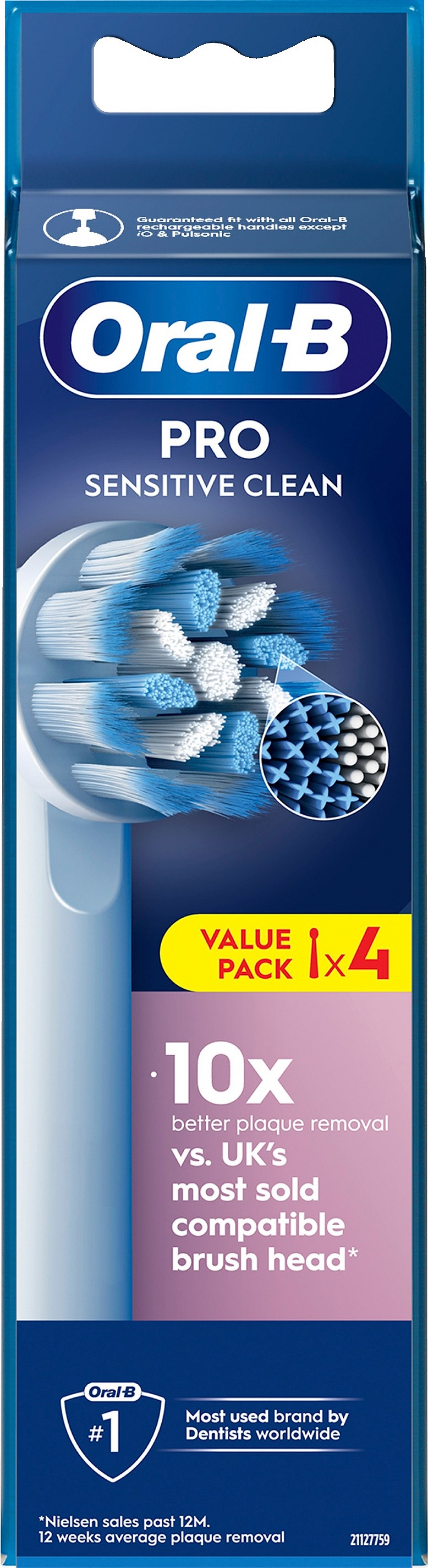 Oral-B Pro Sensitive Clean -harjaspäässä yhdistyy ikenille hellävaraiset, erittäin pehmeät harjakset ja tavalliset harjakset, jotka ovat armottomat plakille. Se poistaa jopa 100 % enemmän plakkia ja vähentää ientulehduksia 100 % verrattuna käsikäyttöiseen hammasharjaan. Aidoissa Oral-B-harjaspäissä on uudet X:n muotoiset harjakset, jotka puhdistavat alueet, joihin pyöreät harjakset eivät yllä. Harjaspään kulumisen ilmaisin muuttaa harjakset vihreästä keltaiseksi, kun on aika vaihtaa harjaspää, mikä takaa aina 100 % puhdistustehon. Yhteensopiva ladattavien Oral-B-sähköhammasharjojen kanssa Pulsonic- & iO-sähköhammasharjoja lukuun ottamatta.