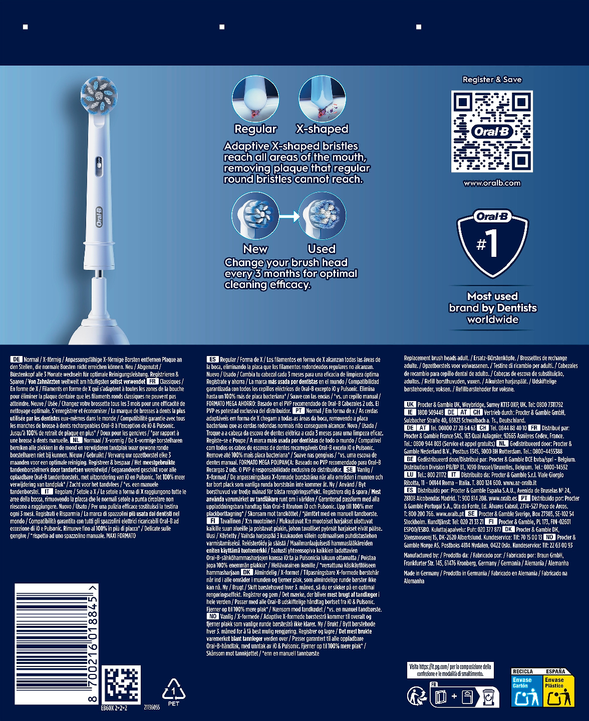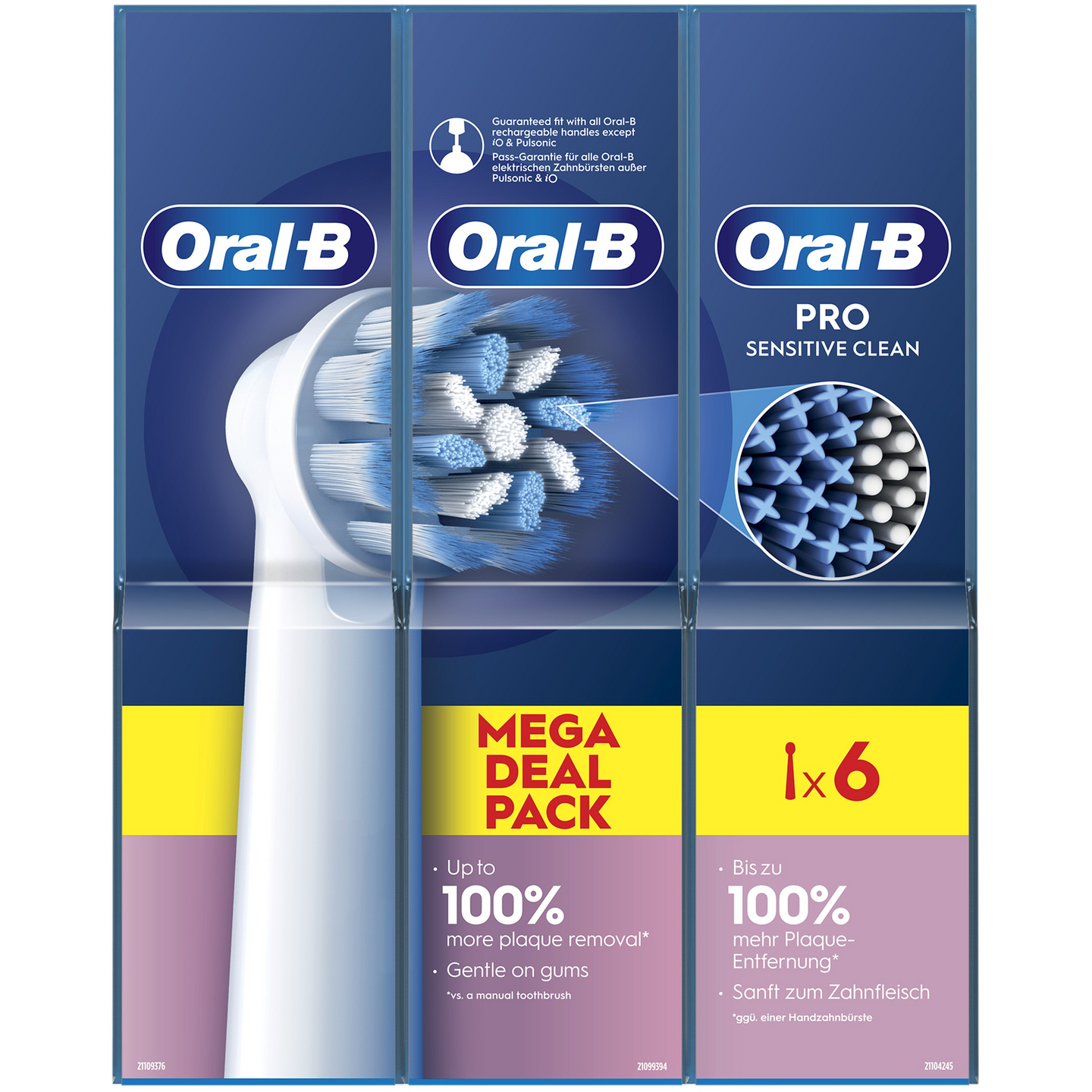 Oral-B Pro Sensitive Clean -harjaspäässä yhdistyy ikenille hellävaraiset, erittäin pehmeät harjakset ja tavalliset harjakset, jotka ovat armottomat plakille. Se poistaa jopa 100 % enemmän plakkia ja vähentää ientulehduksia 100 % verrattuna käsikäyttöiseen hammasharjaan. Aidoissa Oral-B-harjaspäissä on uudet X:n muotoiset harjakset, jotka puhdistavat alueet, joihin pyöreät harjakset eivät yllä. Harjaspään kulumisen ilmaisin muuttaa harjakset vihreästä keltaiseksi, kun on aika vaihtaa harjaspää, mikä takaa aina 100 % puhdistustehon. Yhteensopiva ladattavien Oral-B-sähköhammasharjojen kanssa Pulsonic- & iO-sähköhammasharjoja lukuun ottamatta.